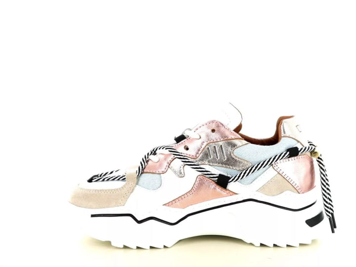 Maak kennis met de Jupiter Denim sneaker van het Nederlandse merk DWRS Label. Deze opvallende damessneaker combineert stijl en comfort op unieke wijze. De buitenzijde is vervaardigd uit een hoogwaardige mix van leer, suède en denimstof in de kleuren rosé en jeansblauw, wat zorgt voor een trendy en veelzijdige look.