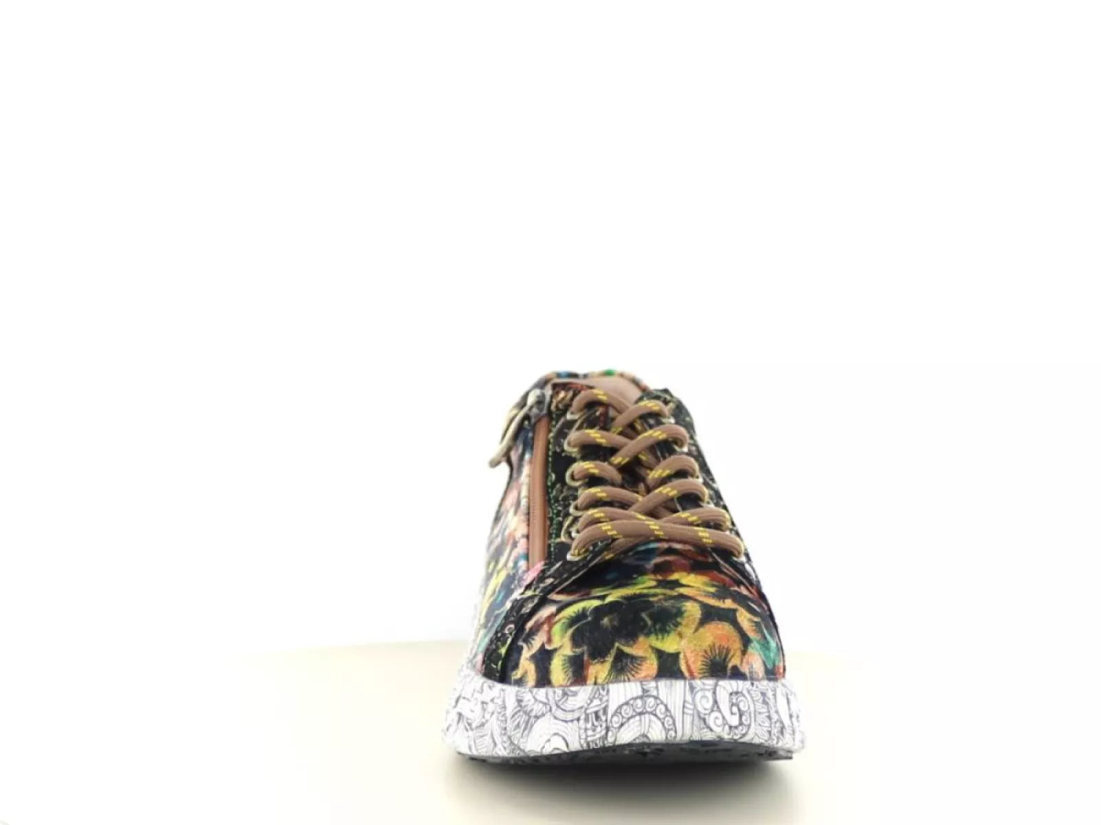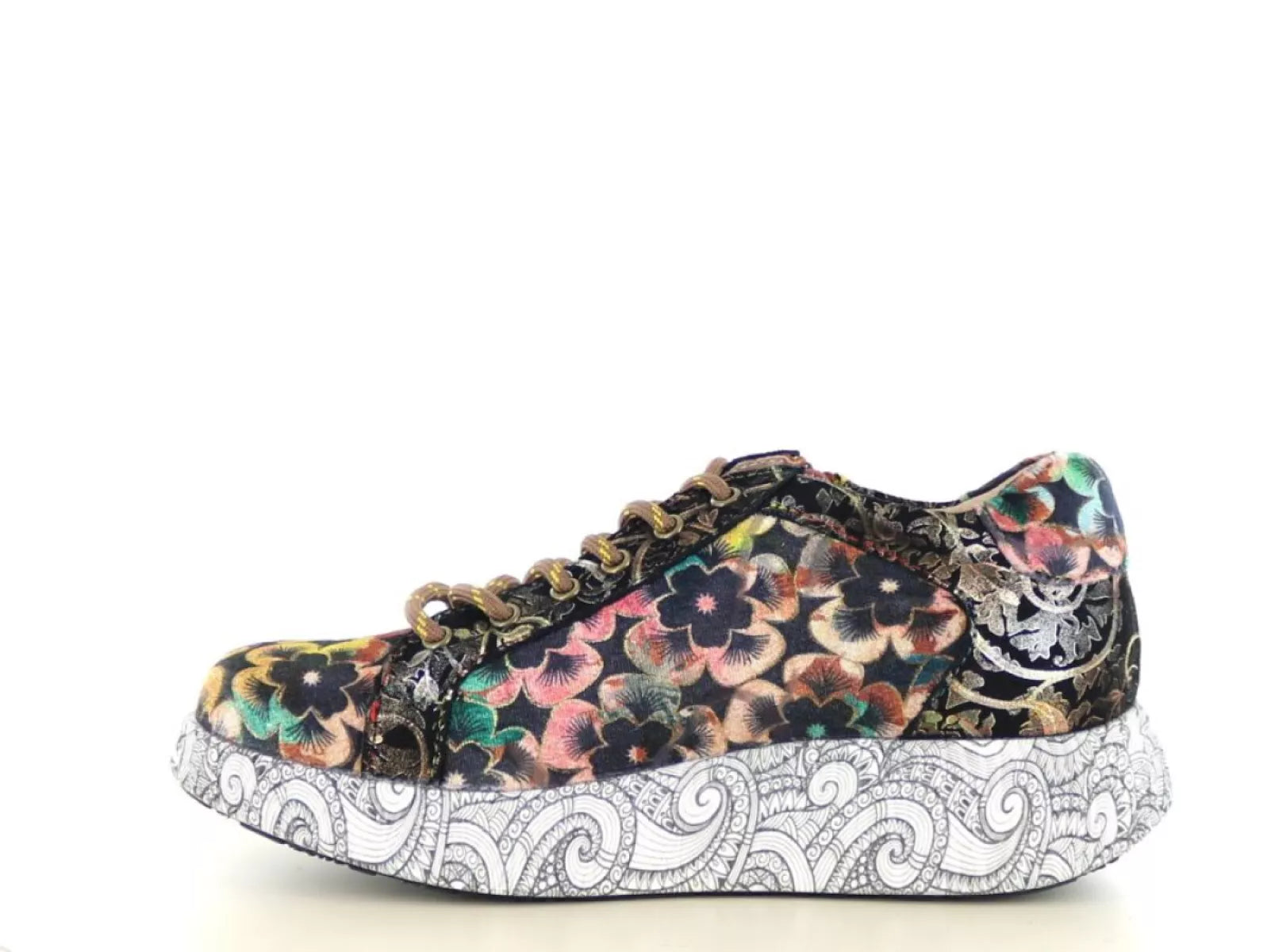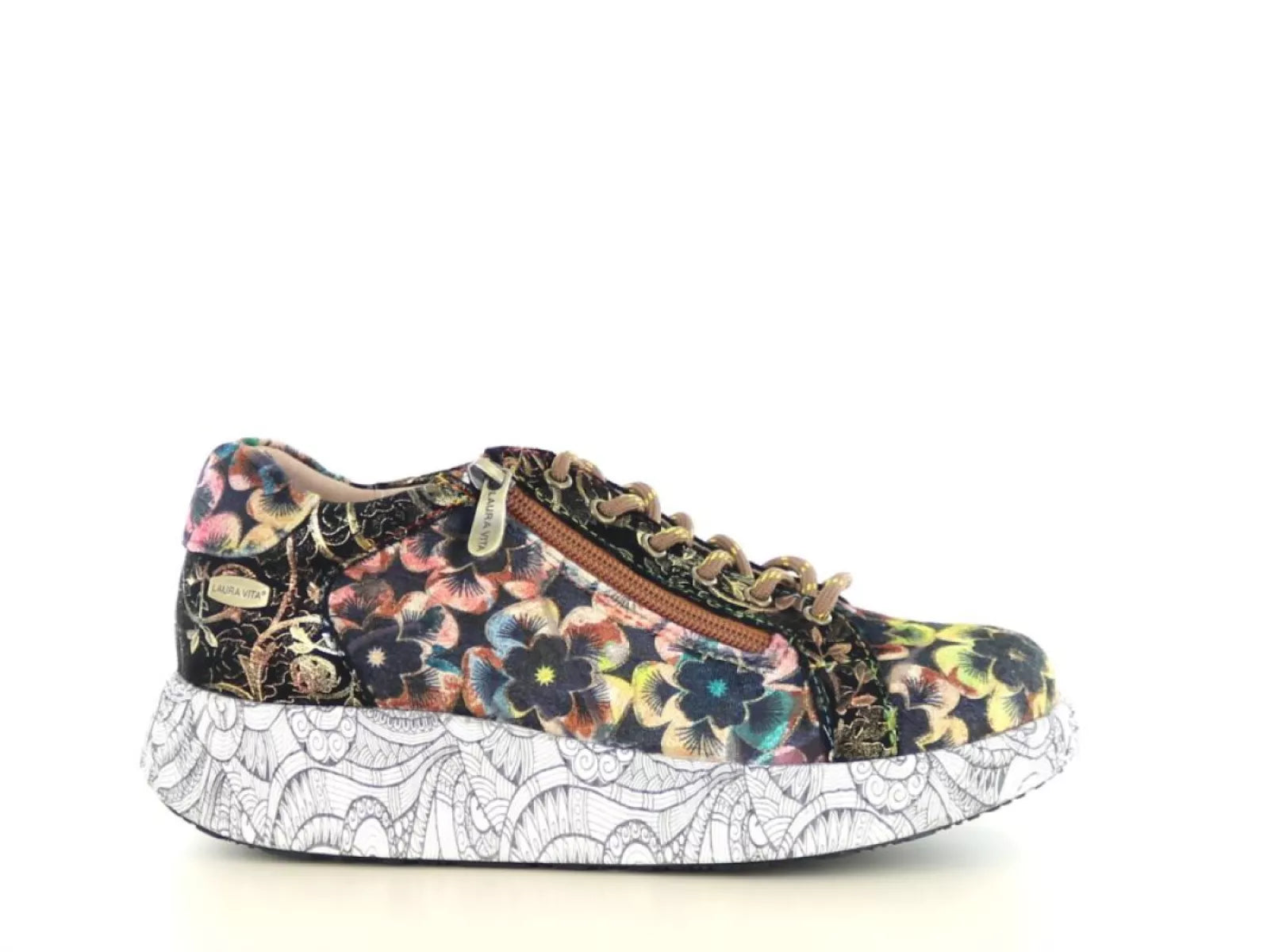 Met de Laura Vita Nikito 04 sneaker geef je elke outfit een speelse en artistieke twist. Deze dames sneaker valt direct op door het prachtige bloemenmotief in warme tinten zoals choco, oker, roze en blauw – perfect gecombineerd met een opvallende witte zool met zwart lijnenspel. Een waar kunstwerk voor je voeten!