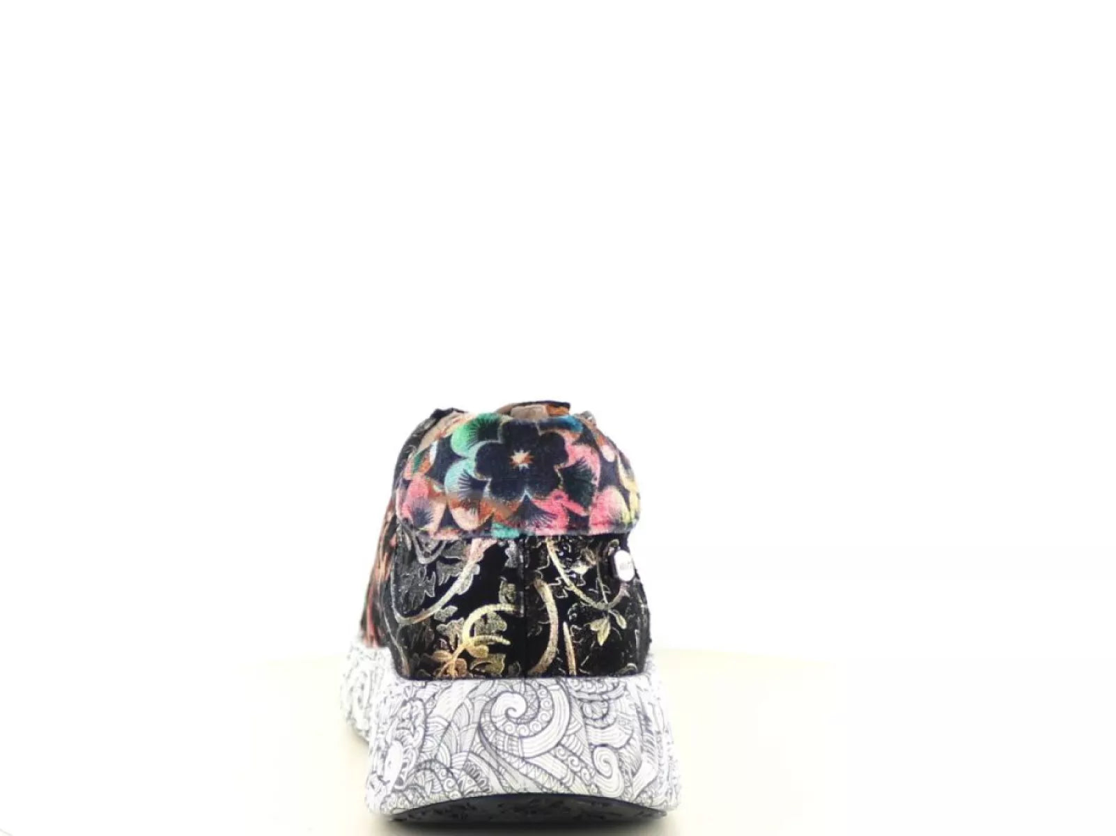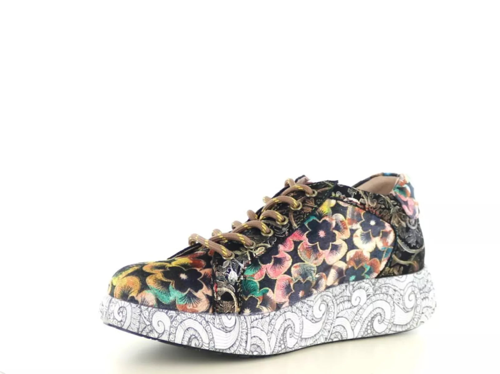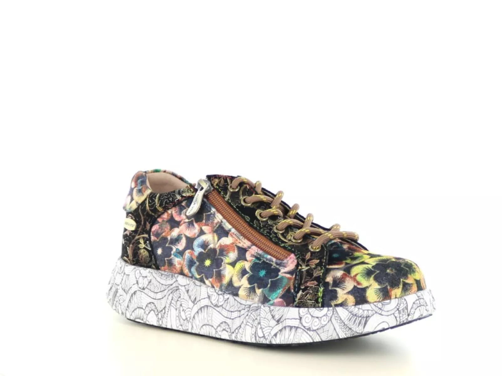 Met de Laura Vita Nikito 04 sneaker geef je elke outfit een speelse en artistieke twist. Deze dames sneaker valt direct op door het prachtige bloemenmotief in warme tinten zoals choco, oker, roze en blauw – perfect gecombineerd met een opvallende witte zool met zwart lijnenspel. Een waar kunstwerk voor je voeten!