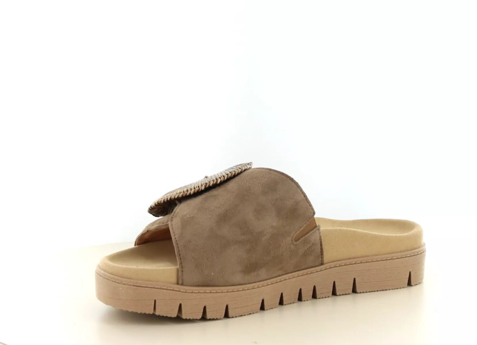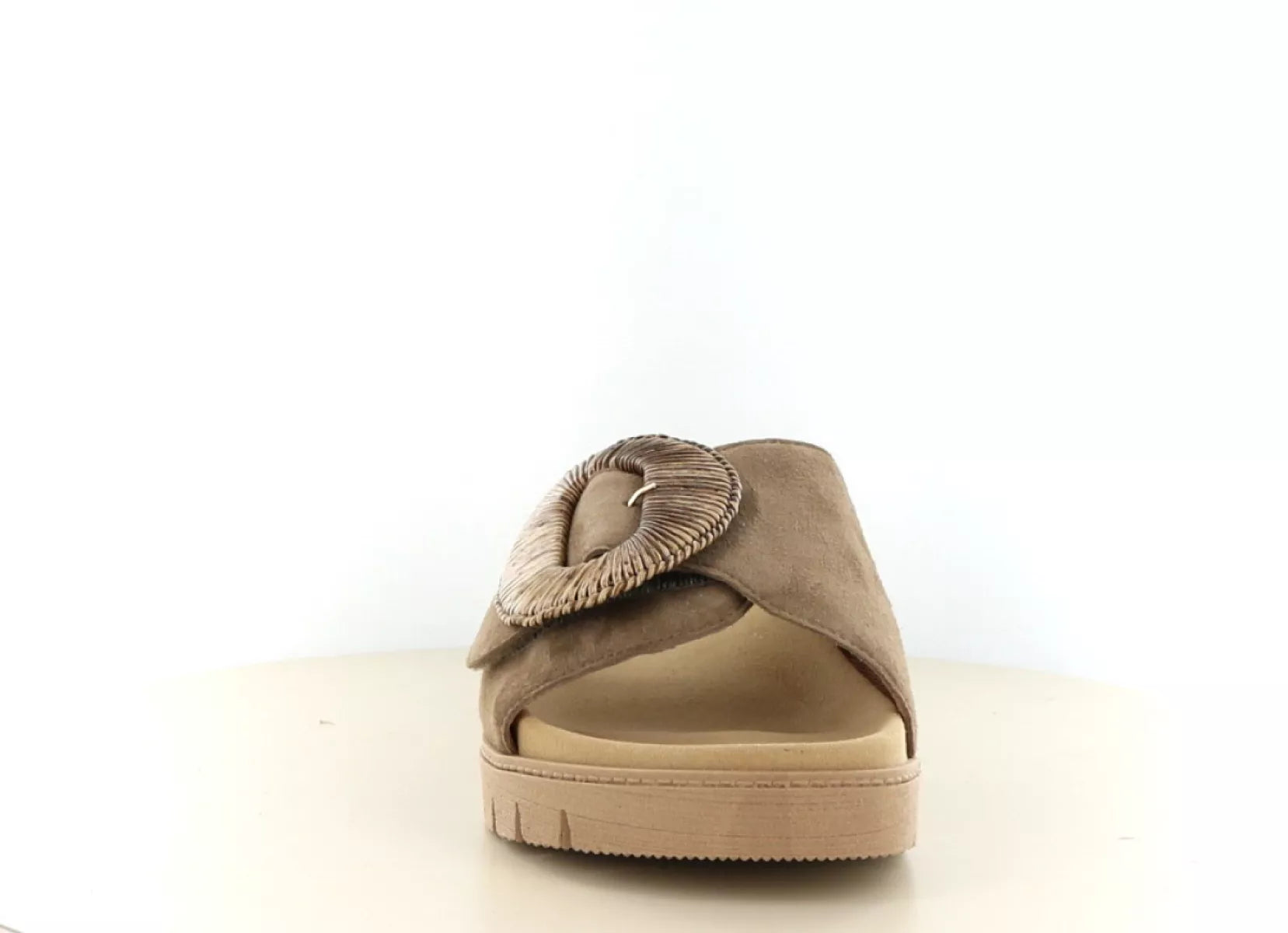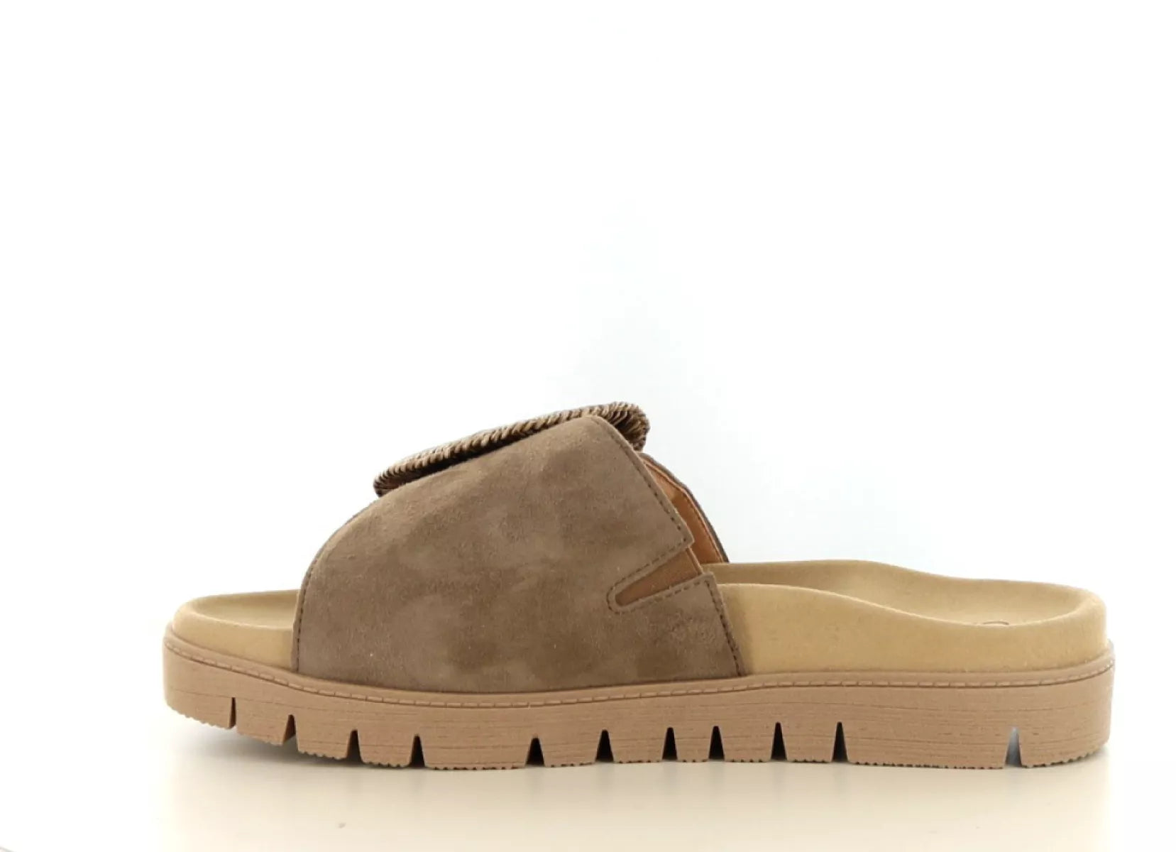 Het bovenwerk is uitgevoerd in zacht suède in een warme taupe/bruintint. De brede band over de wreef is voorzien van een decoratieve gesp, terwijl de sluiting subtiel is weggewerkt met klittenband. Hierdoor kunt u de slipper eenvoudig aanpassen aan uw voet voor een optimale pasvorm.
