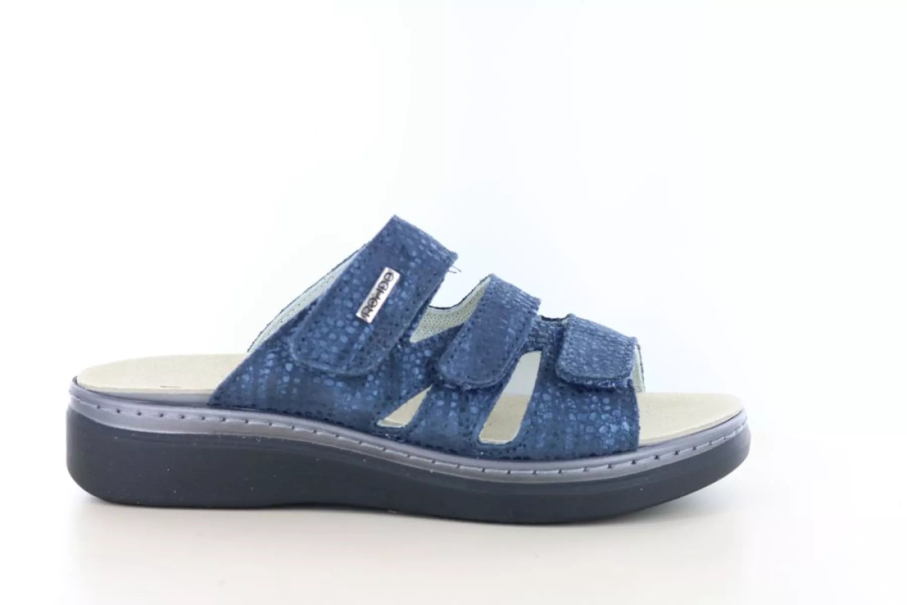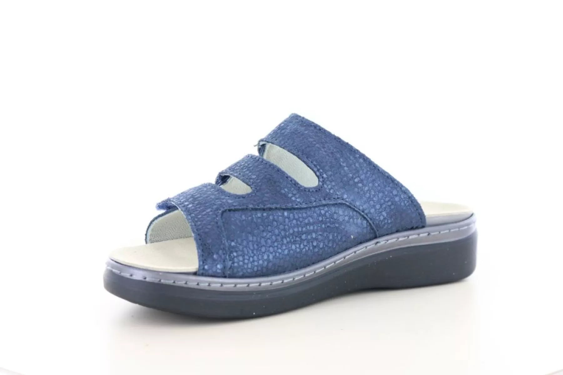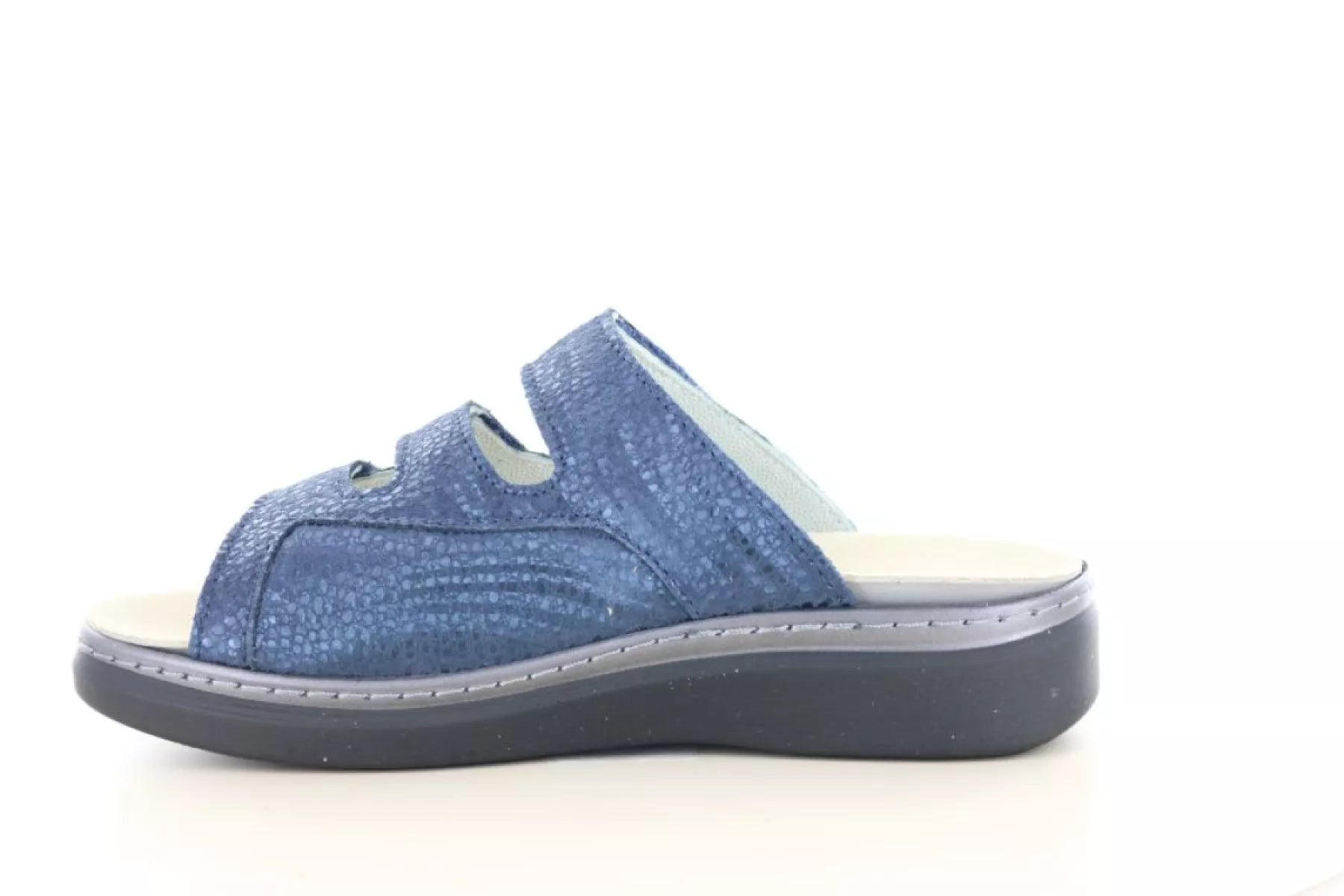 De drie banden met klittenbandsluiting zorgen ervoor dat je de slipper volledig naar wens kunt afstellen. Zo geniet je van een stabiele pasvorm en goede ondersteuning bij iedere stap. Het uitneembare voetbed maakt het mogelijk om je eigen steunzolen te gebruiken, wat ideaal is bij voetklachten zoals hallux valgus of doorgezakte voeten.
