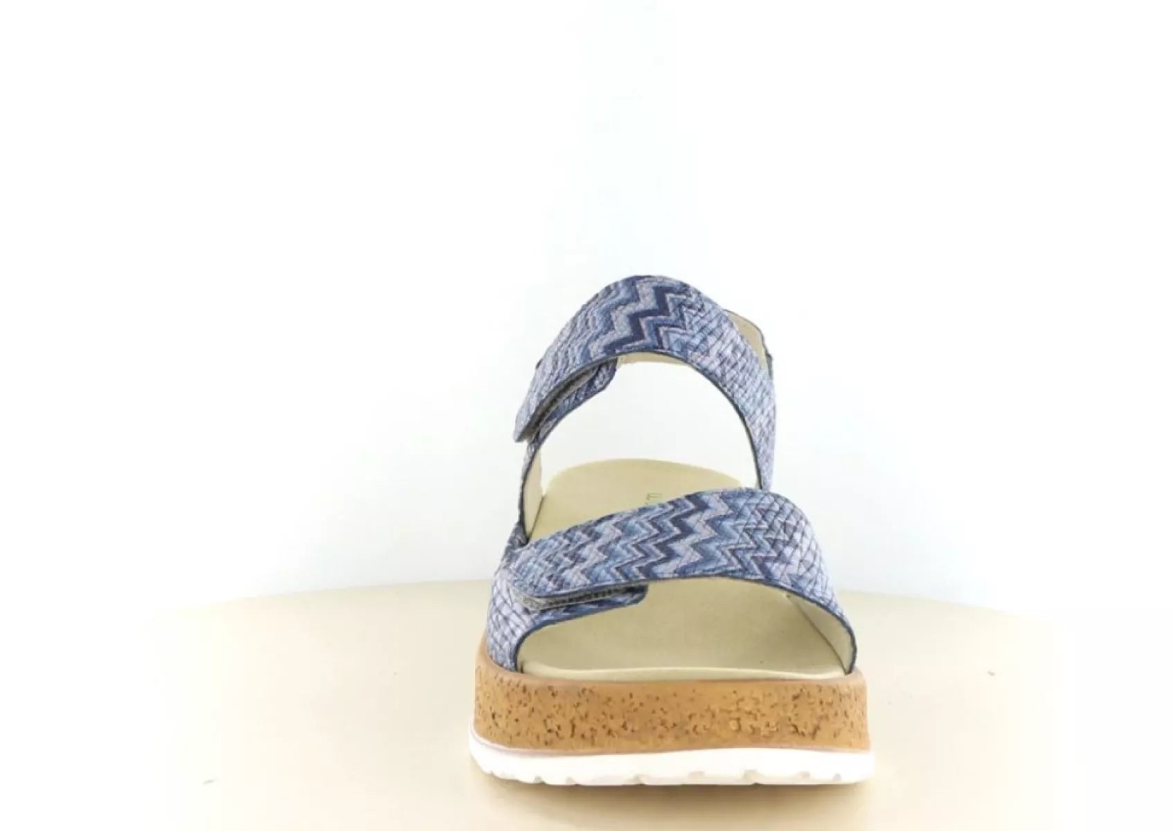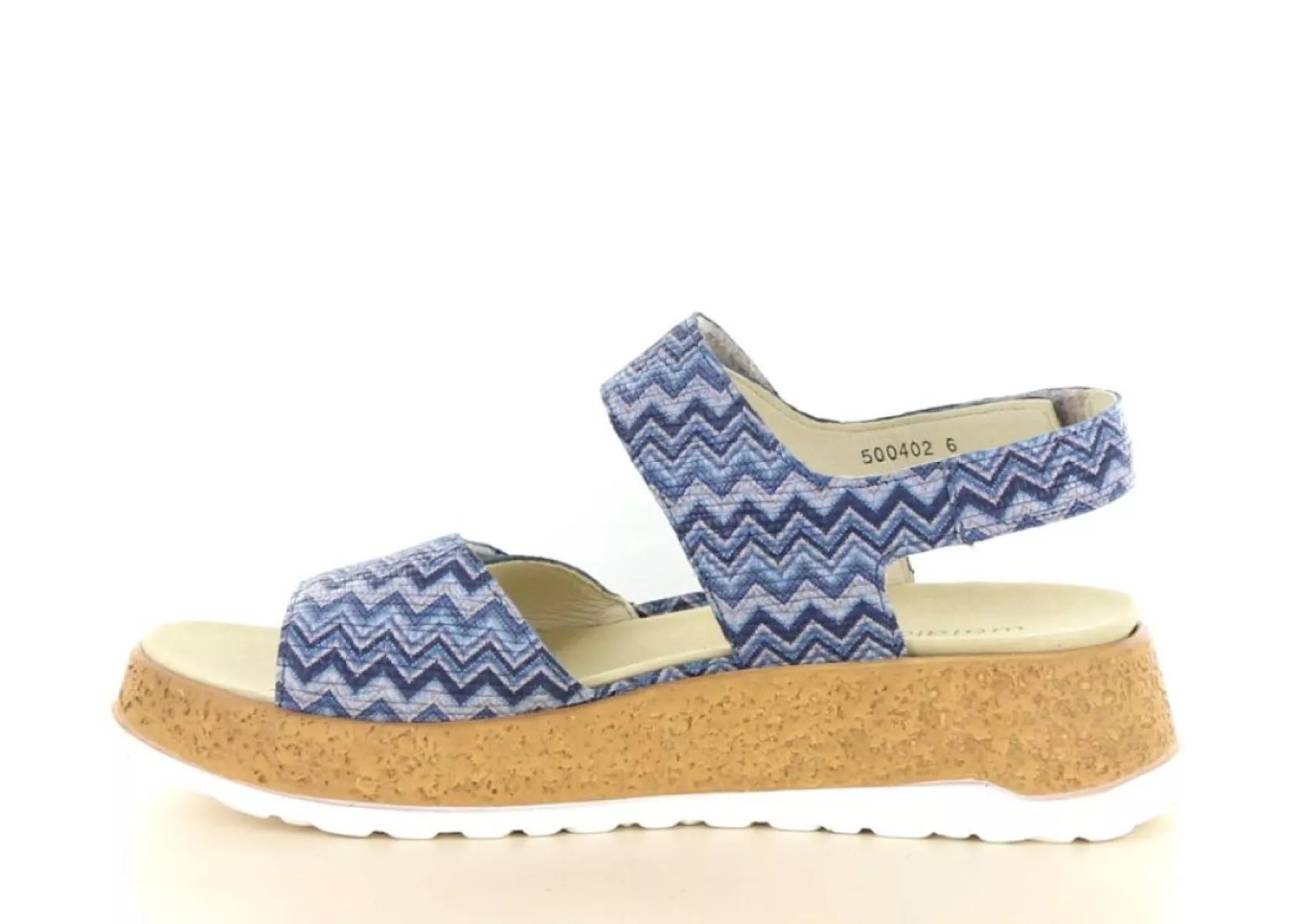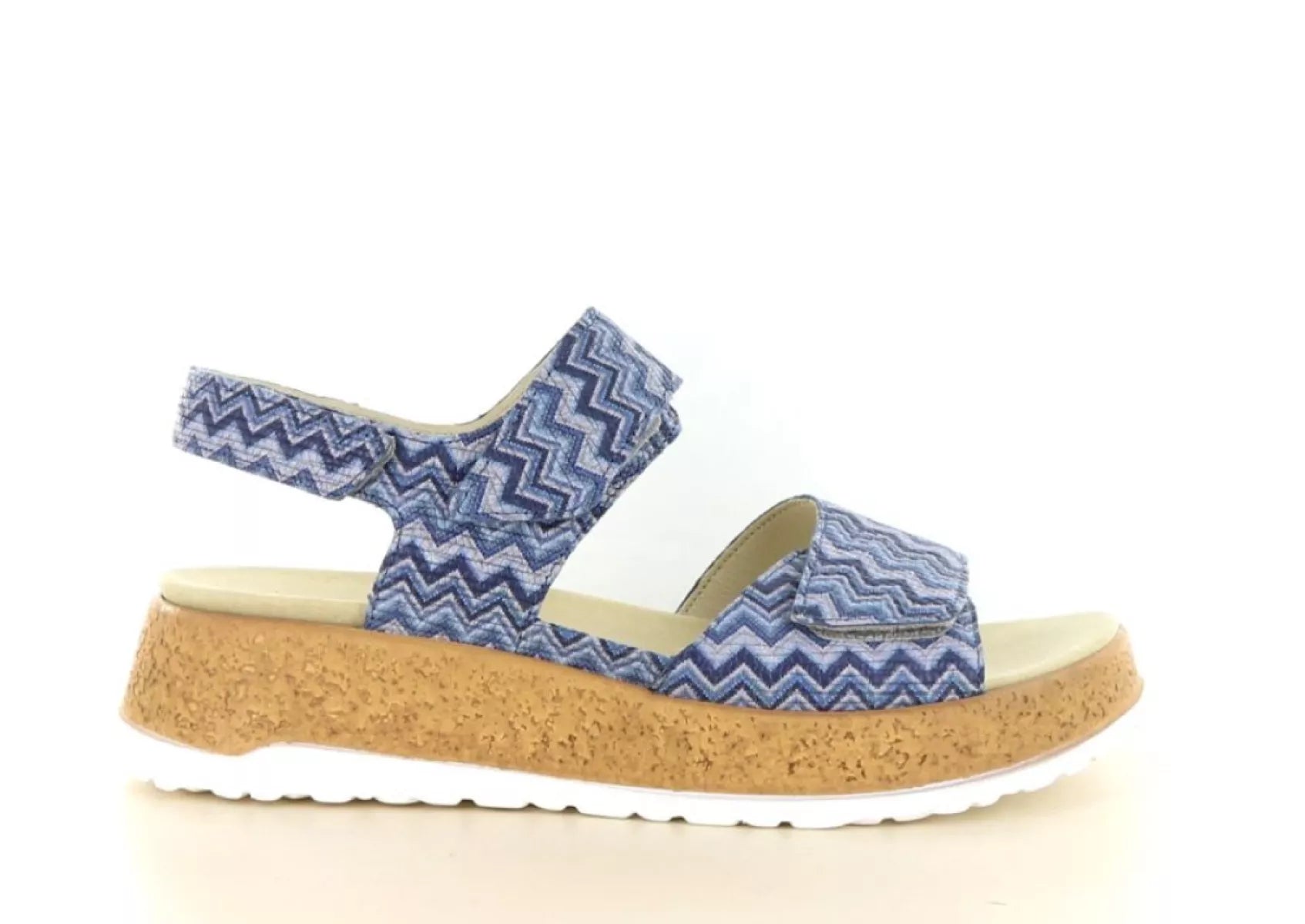 Het bovenwerk van hoogwaardig leer is uitgevoerd in een speels blauw zigzagdesign, wat zorgt voor een frisse en zomerse uitstraling. Deze sandaal combineert moeiteloos comfort met een eigentijdse look – perfect onder een jurk, rok of luchtige broek.