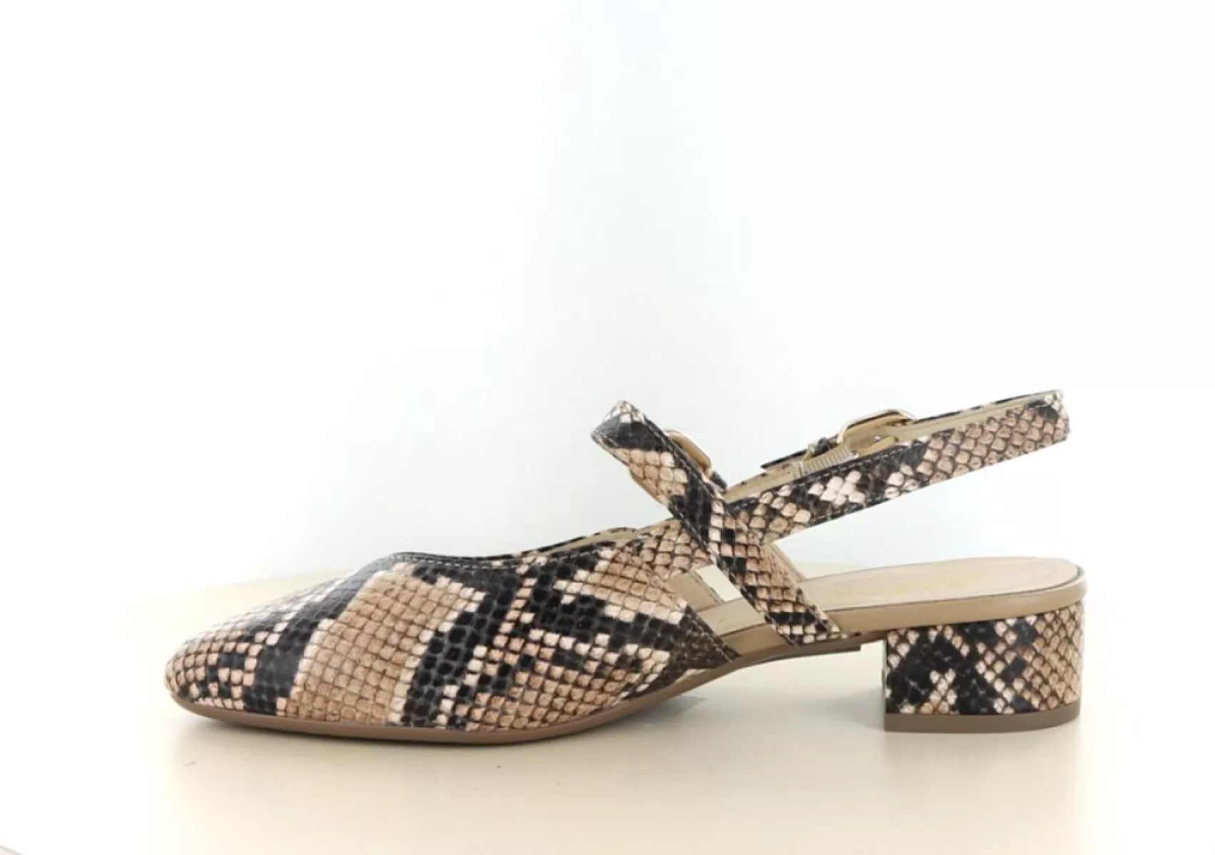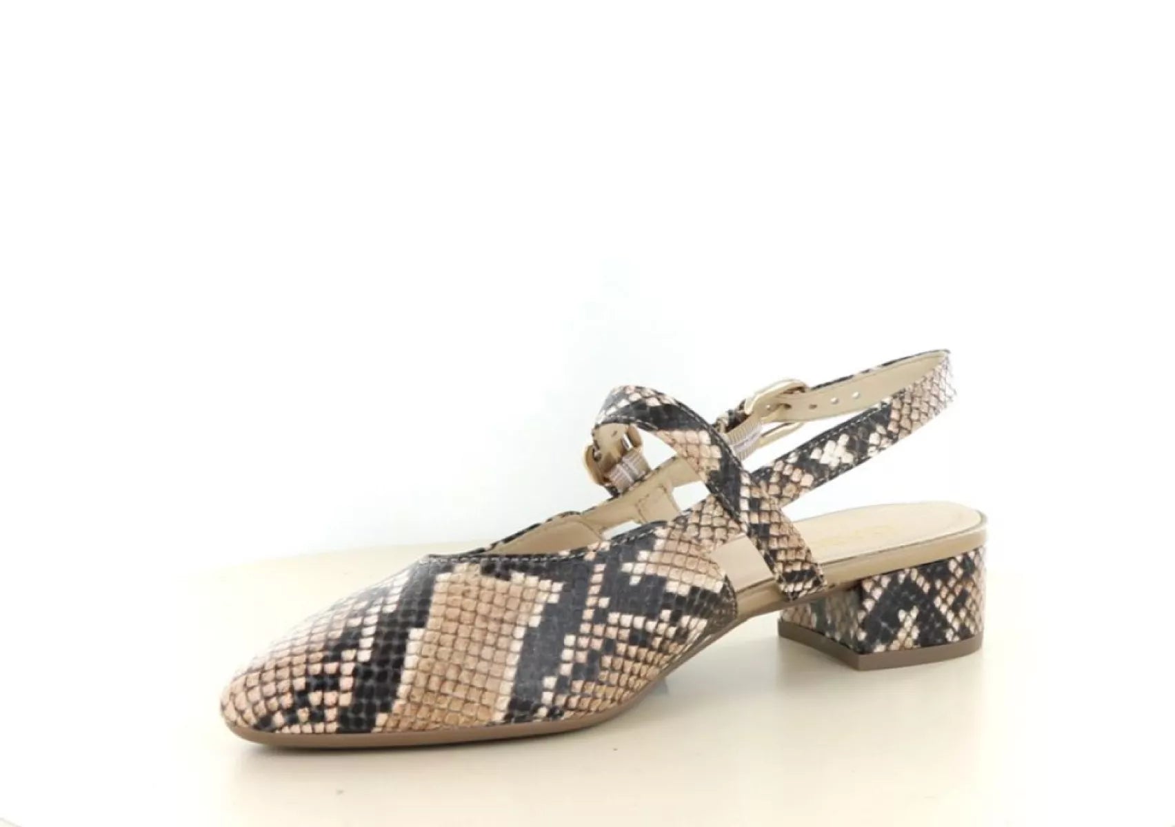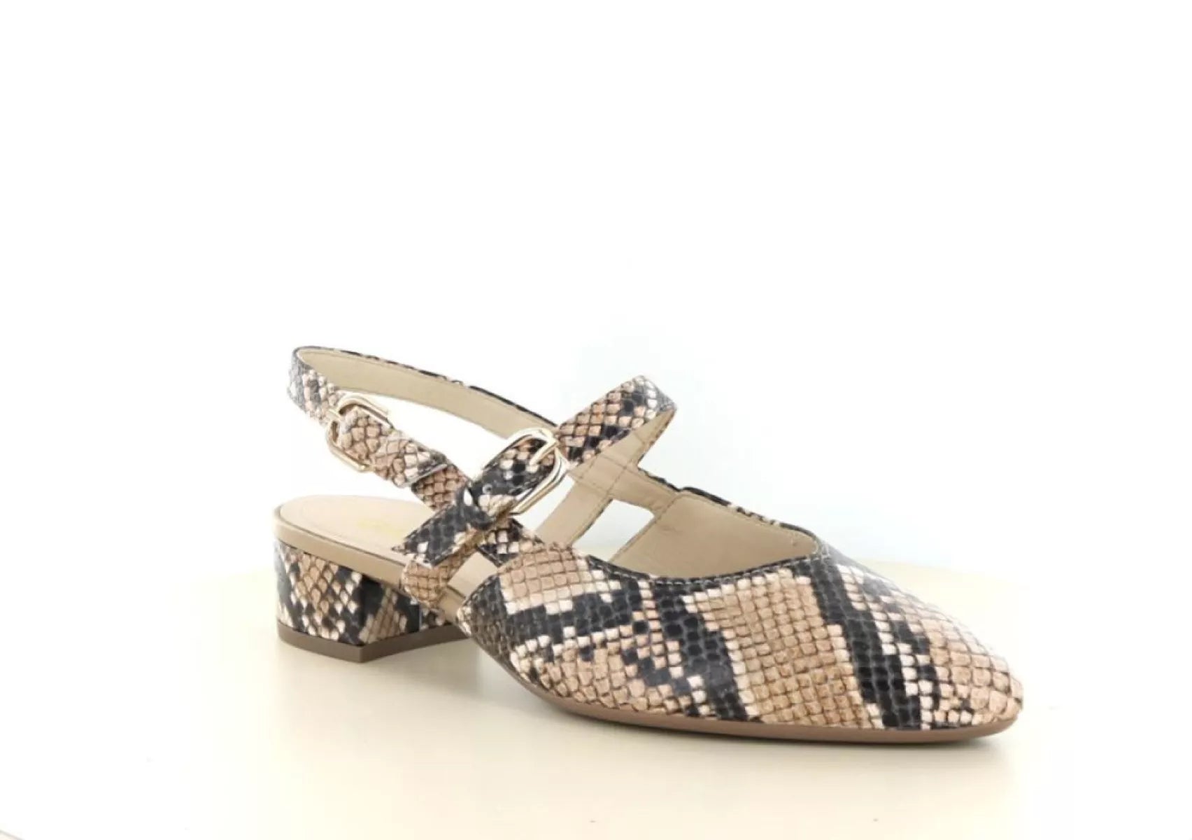 Voeg een vleugje elegantie toe aan uw collectie met deze modieuze Gabor dames slingback met pythonprint – een tijdloze keuze met een trendy twist.