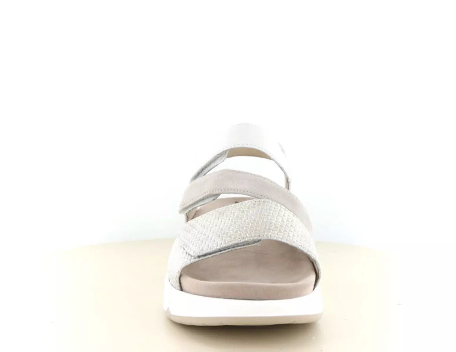 Het bovenwerk is vervaardigd uit soepel leer en suède, wat zorgt voor een luxe uitstraling en een aangenaam gevoel rond de voet. De lichte beige- en offwhite tinten maken deze sandaal veelzijdig en eenvoudig te combineren met zomerse jurken, linnen broeken of casual outfits. De subtiele structuur op de voorband geeft het geheel een verfijnde, moderne look.