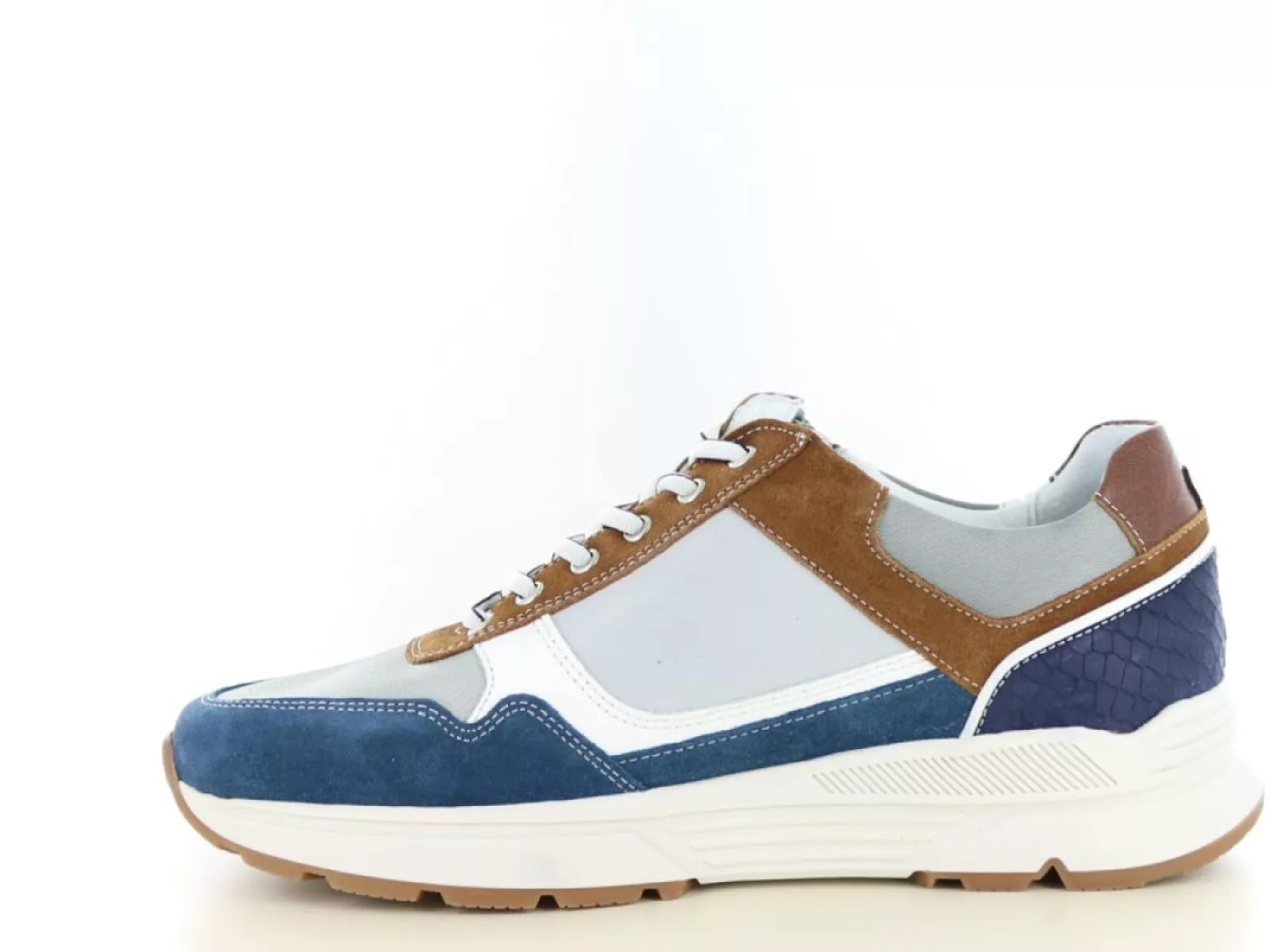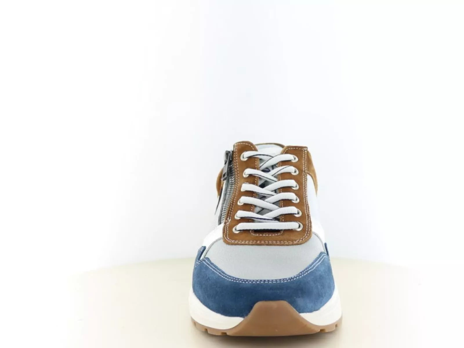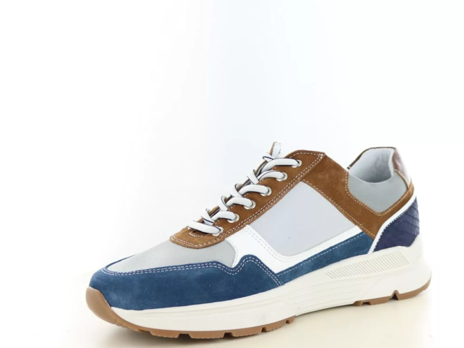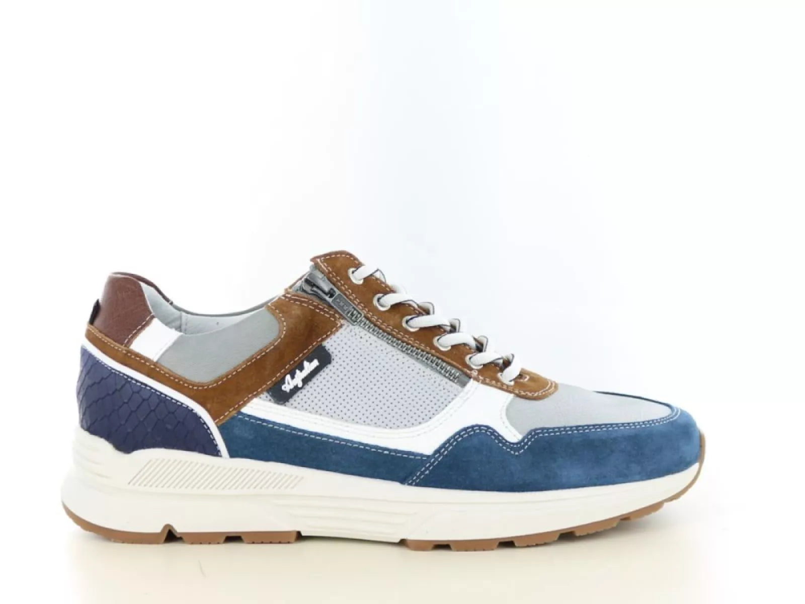 De Australian Connery is een verfijnde veterschoen voor heren, vervaardigd uit premium leermateriaal. De unieke combinatie van veters en een rits zorgt voor een gemakkelijke instap en een verstelbare, stevige pasvorm. De elegante grijs/blauw/cognac kleurcombinatie maakt deze schoen een veelzijdige aanvulling op elke garderobe. Dankzij de uitneembare binnenzool is het eenvoudig om eigen steunzolen te plaatsen, wat bijdraagt aan gepersonaliseerd draagcomfort. Met een wijdtemaat H biedt deze schoen een brede pasvorm, ideaal voor heren met bredere voeten. De leren voering bevordert het ademend vermogen en zorgt voor langdurig comfort gedurende de dag.