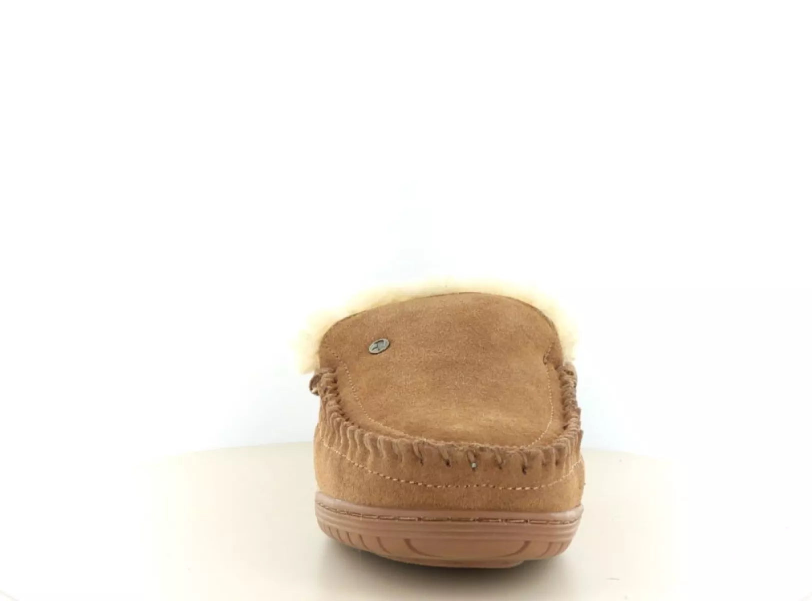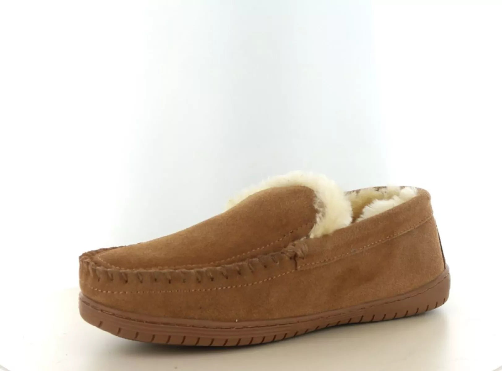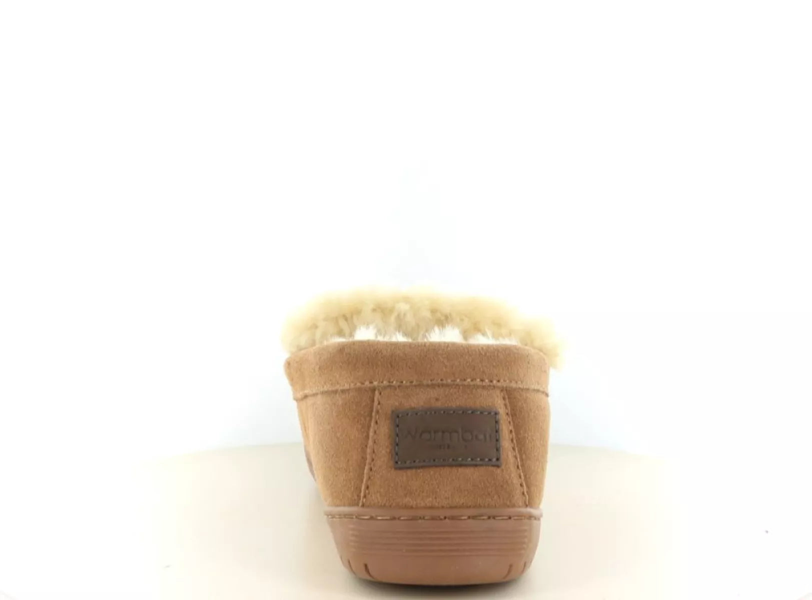 Warmbat Grizzly Men – Suède herenpantoffel met dichte hiel en wolvoering in cognac