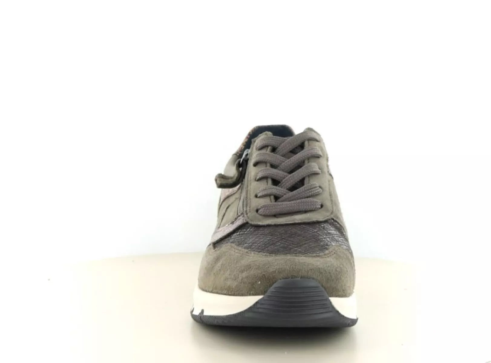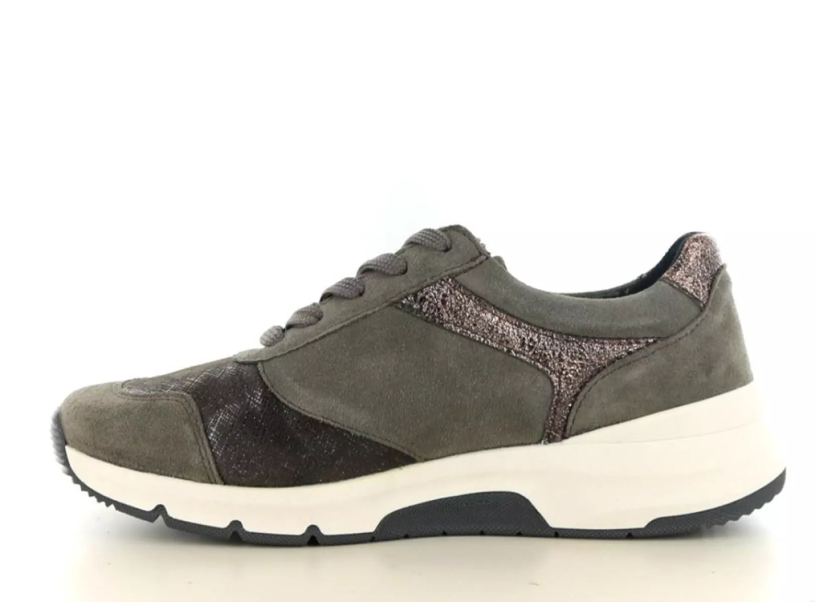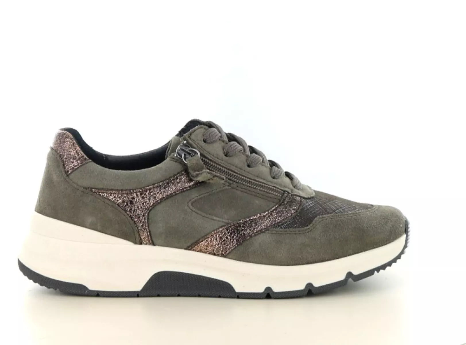 - Lage damessneaker in khaki/groen met modieuze metallic accenten