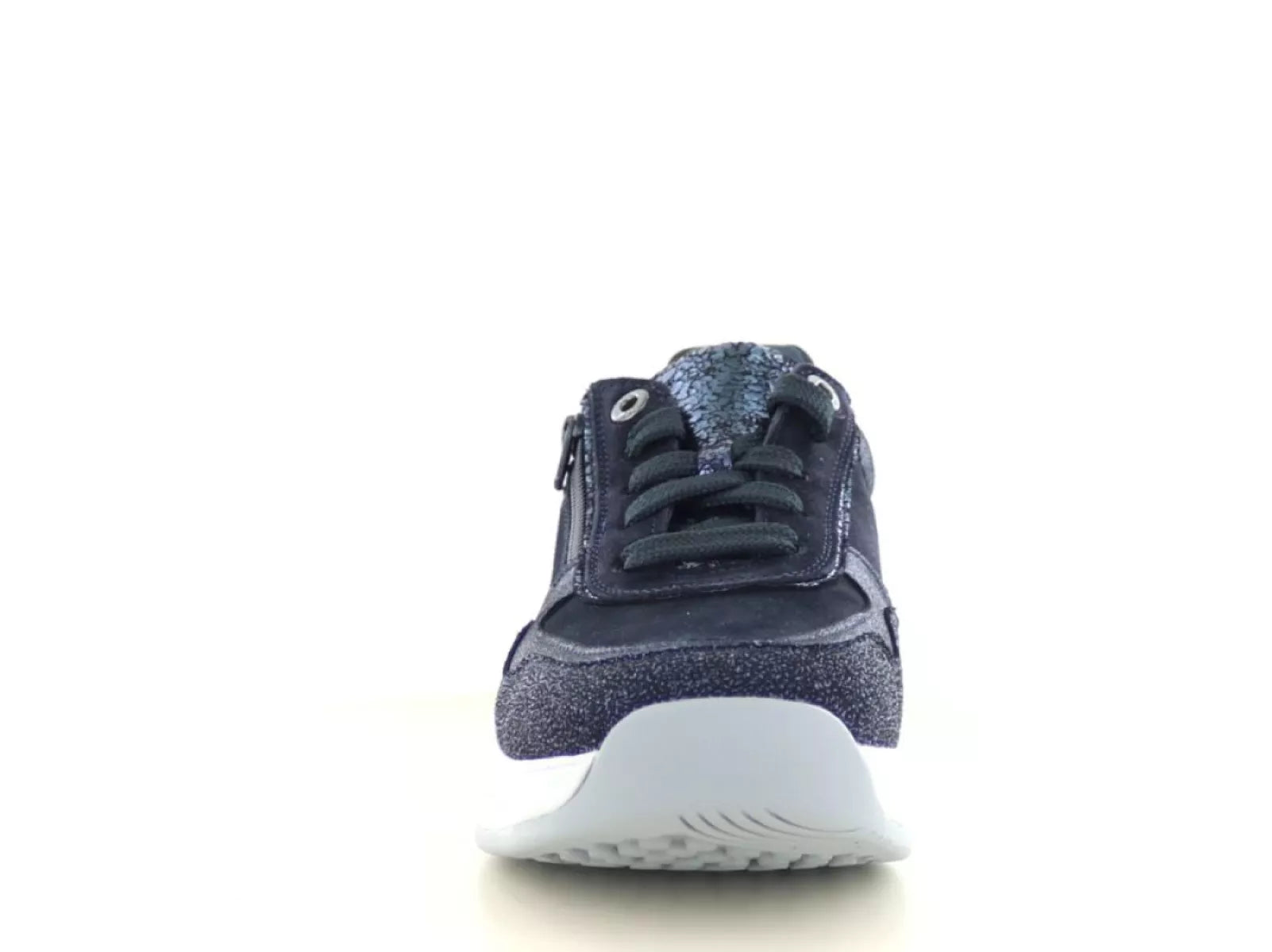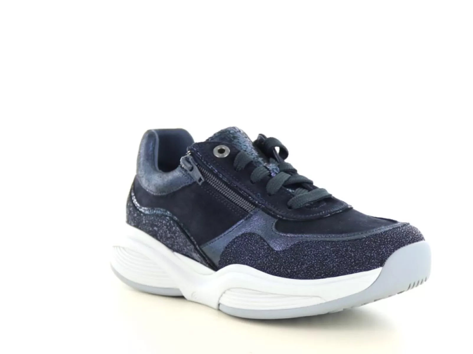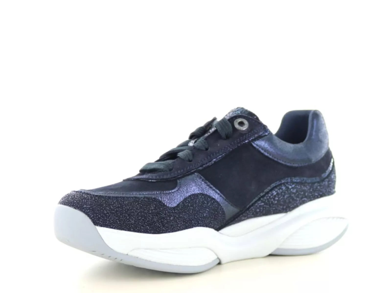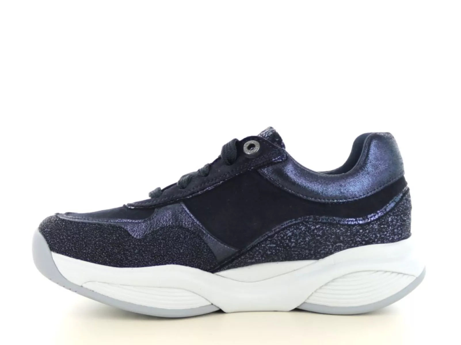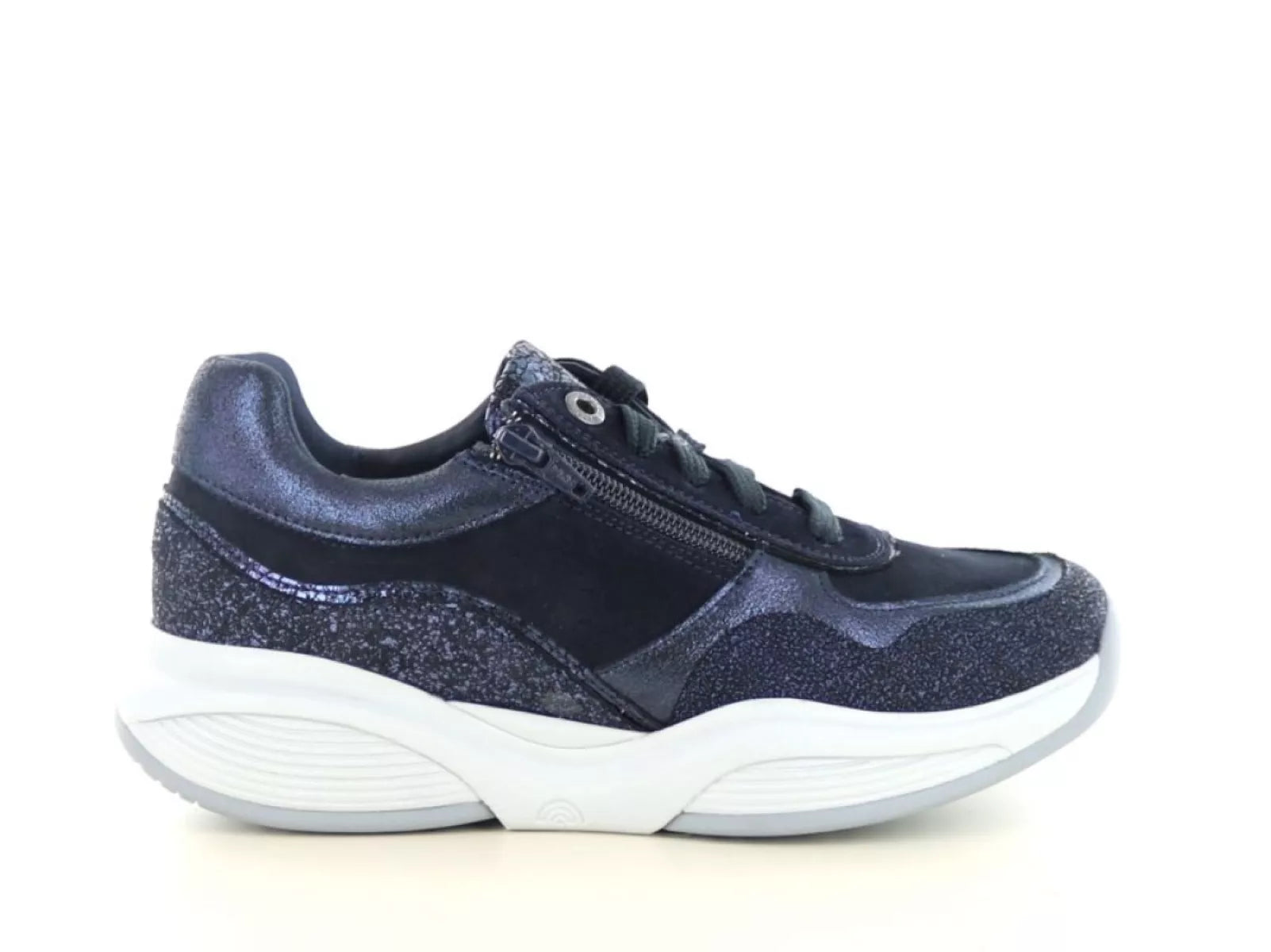 De Xsensible Stretchwalker SWX11 in navy is de perfecte combinatie van elegant design en geavanceerde technologie. Deze sportieve veterschoen voor dames valt direct op door de mix van glanzend metallic leer, suède en glitteraccenten, en is daarmee zowel casual als stijlvol te dragen.