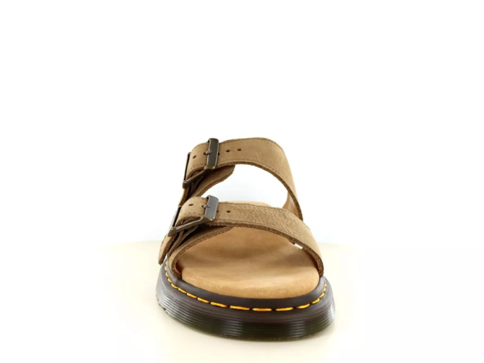 De New Shores Slide van Dr. Martensis een mooie slipper gemaakt van suede, voor heren. Deze slipper is uitgevoerd in de kleur savannah tan tumbled. De sluiting is door middel van een gesp.