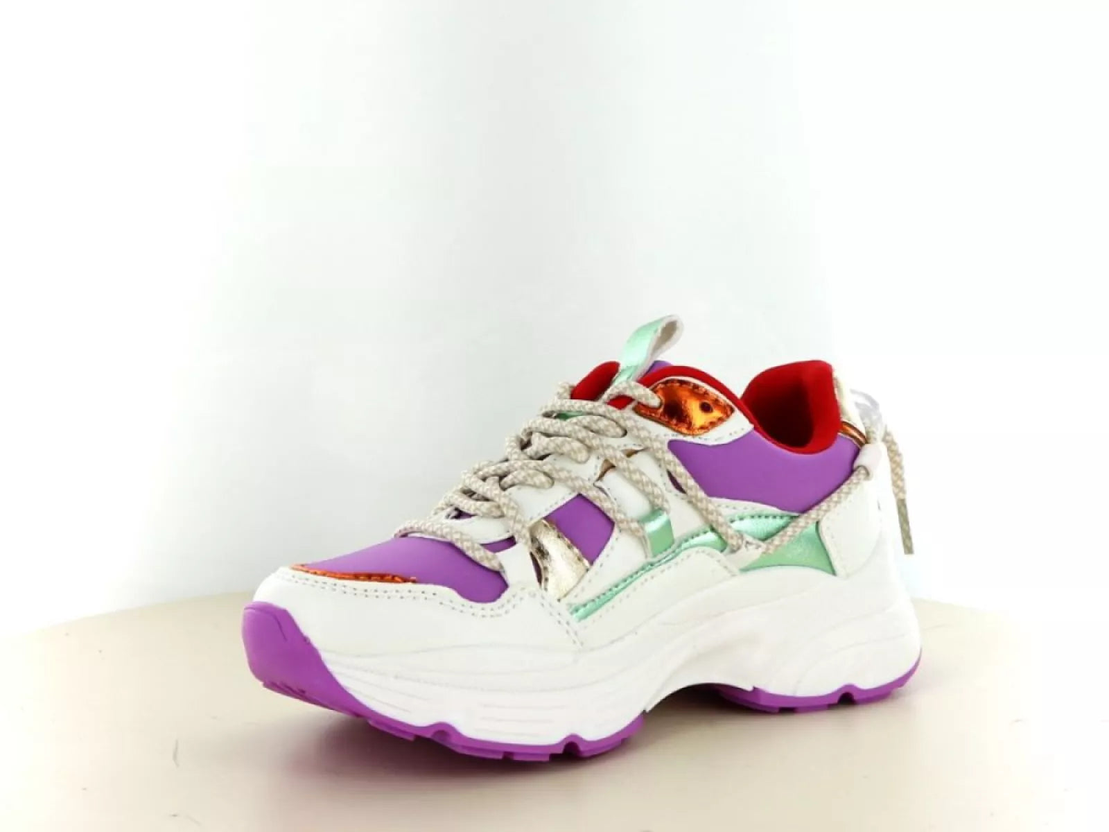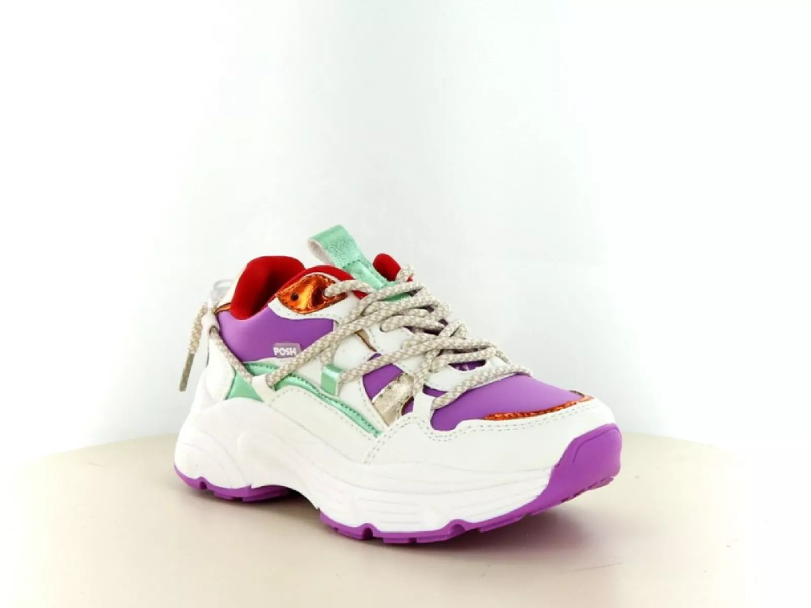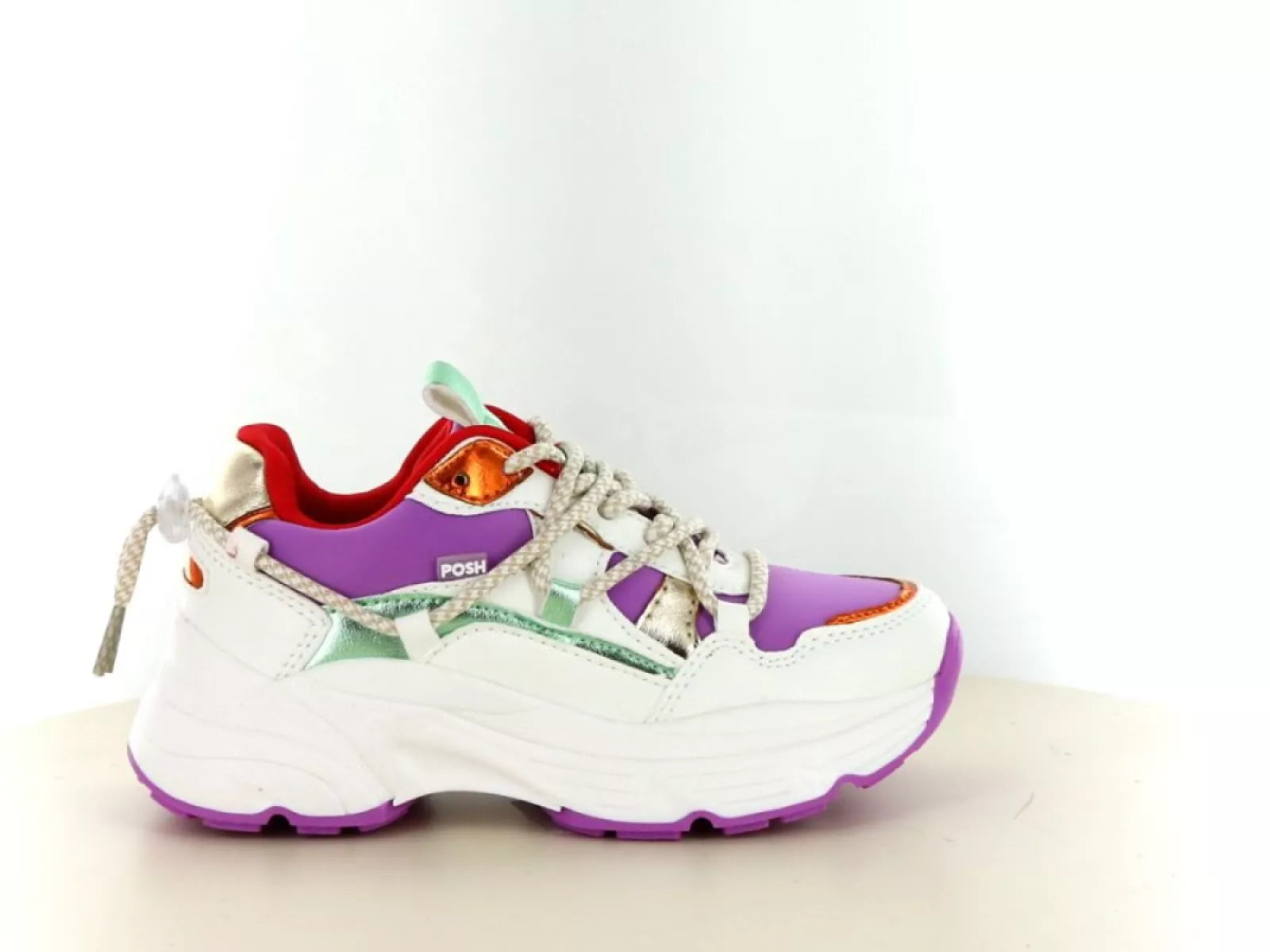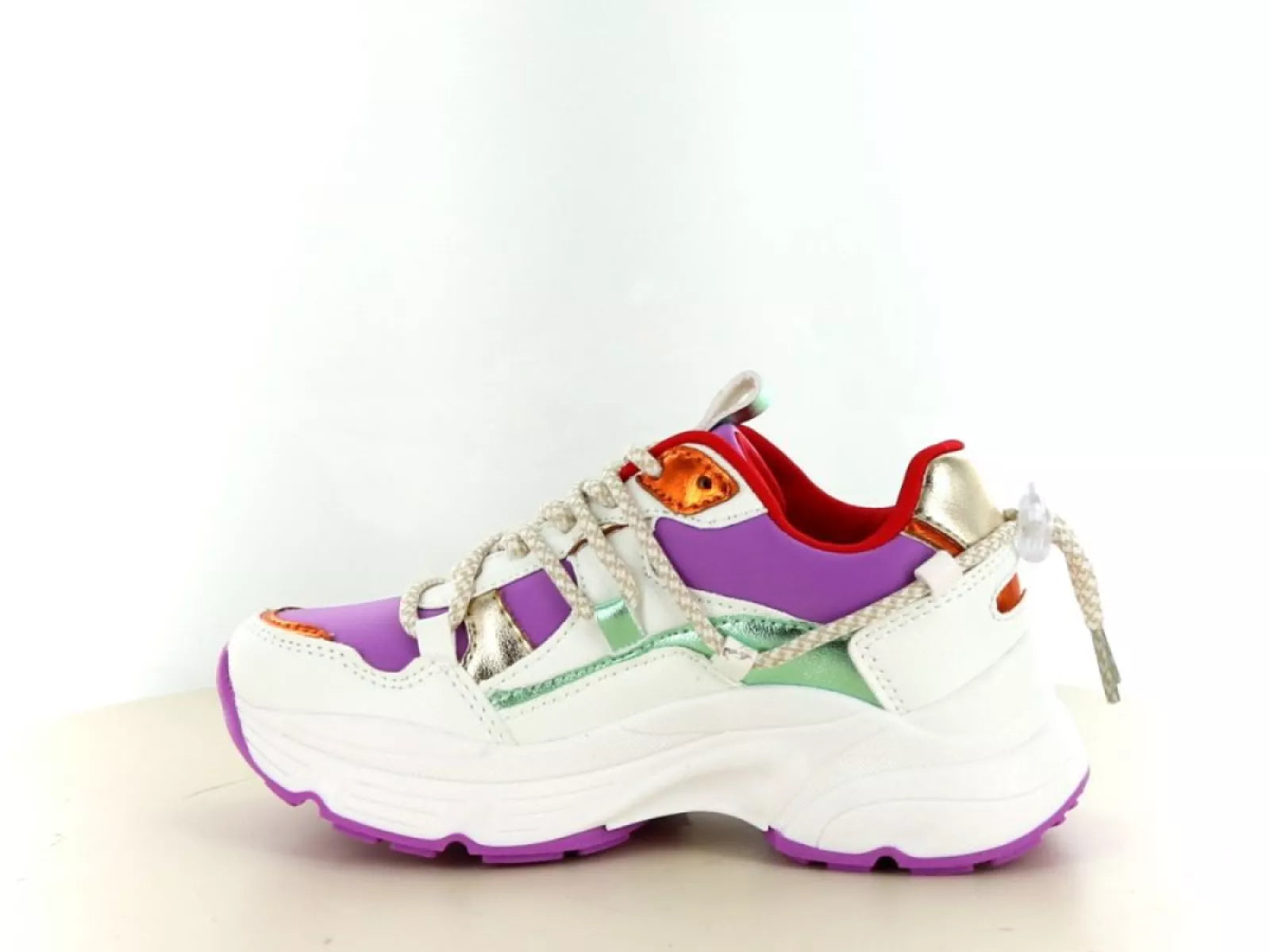 Met de frisse witte basis en speelse paarse, rode en metallic accenten is deze sneaker een echte eyecatcher. Het chunky model sluit perfect aan bij de hedendaagse trends, terwijl de lichte zool zorgt voor ultiem draagcomfort en flexibiliteit – ideaal voor actieve kids die graag rennen en spelen.