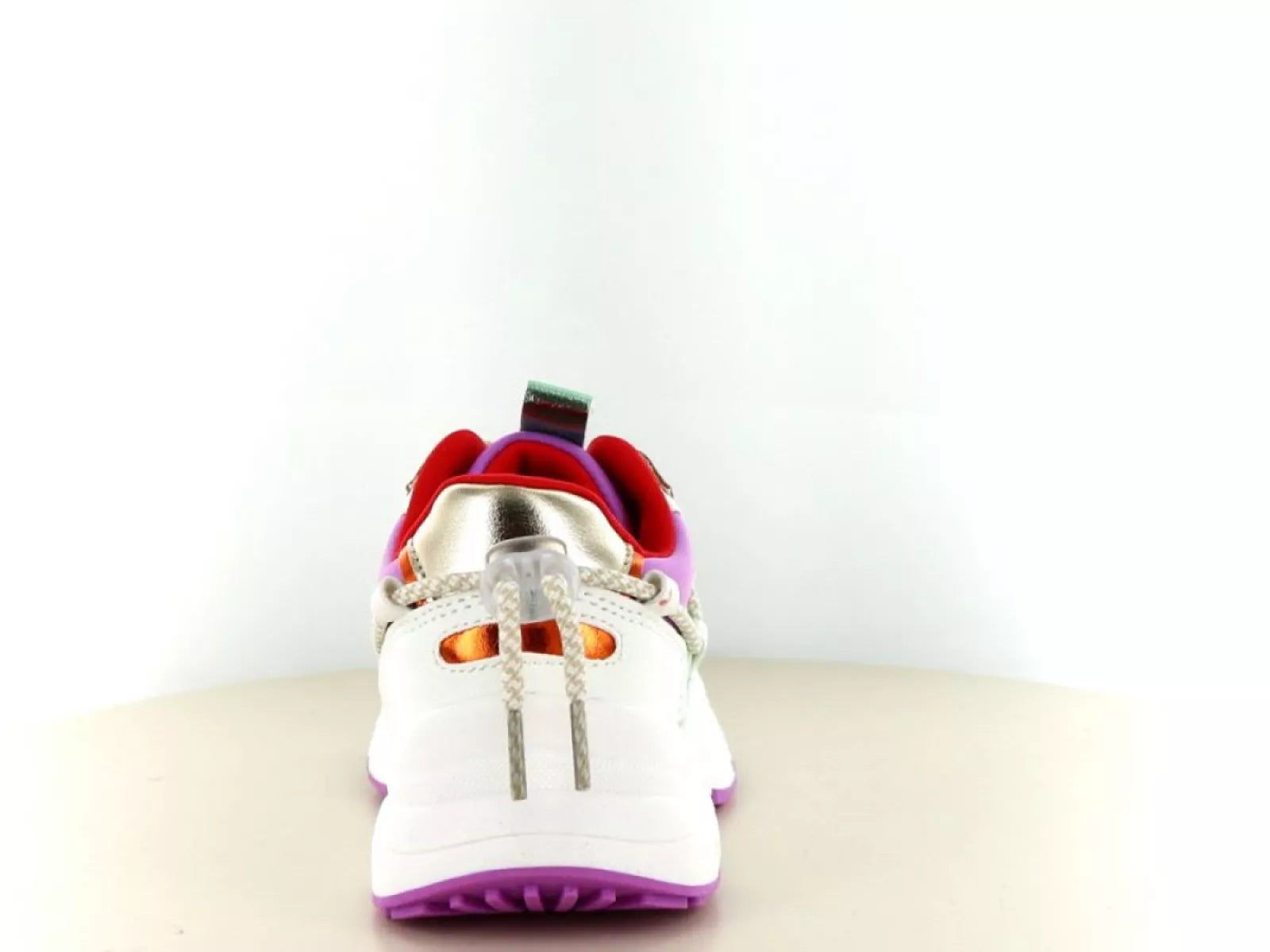 - Trendy ontwerp: Stijlvolle witte sneaker met opvallende paarse en kleurrijke accenten.