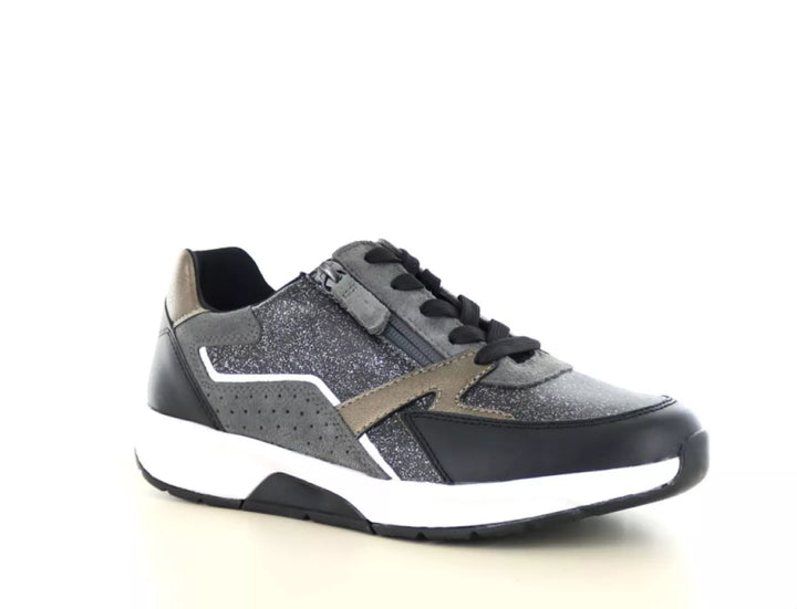 Maak kennis met de Gabor Rollingsoft 76.878 – een stijlvolle én functionele damesschoen die perfect balanceert tussen mode en comfort. Deze moderne sneaker in de kleur anthrazit (grijs/zwart) valt op door de subtiele glans en speelse metallic details, waarmee je elke outfit net dat beetje extra geeft.