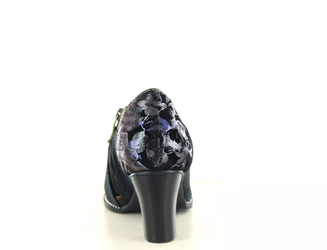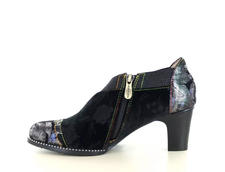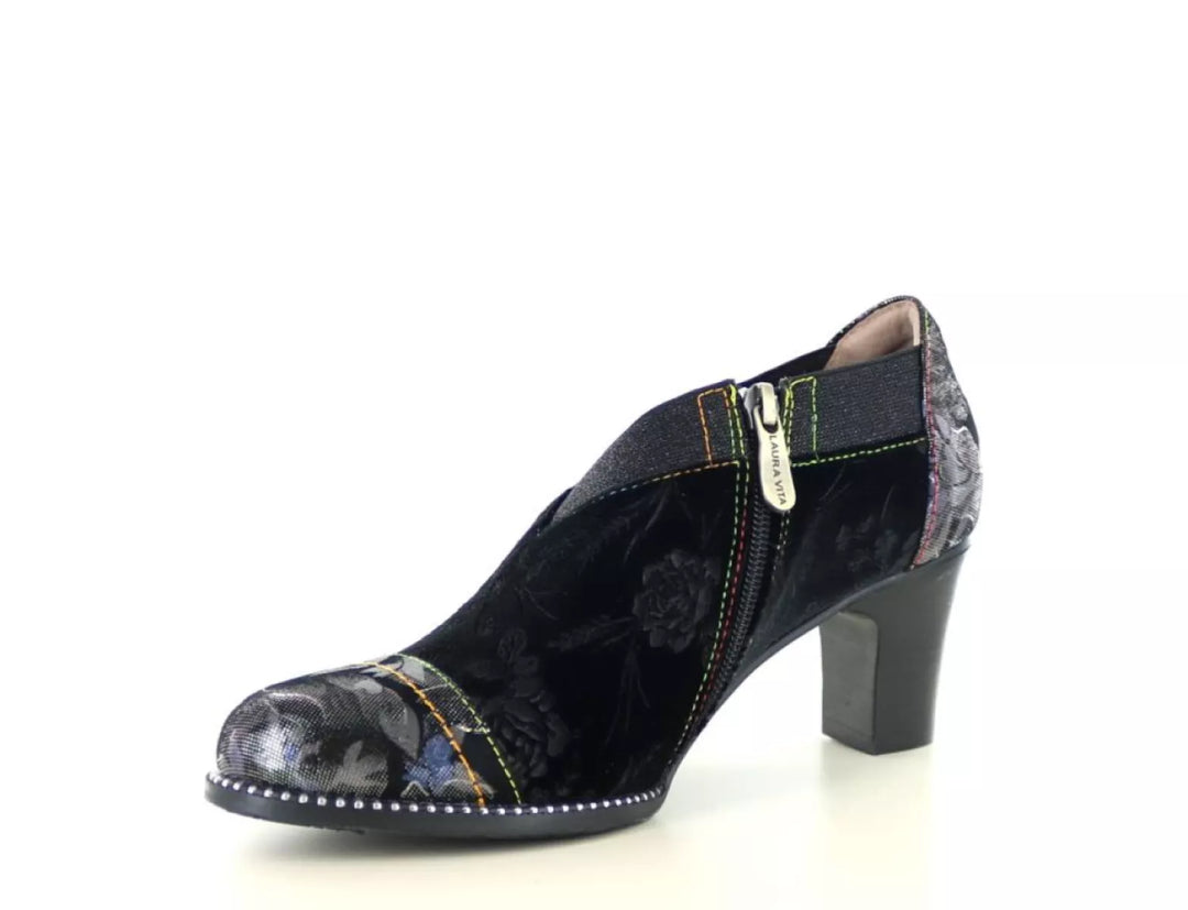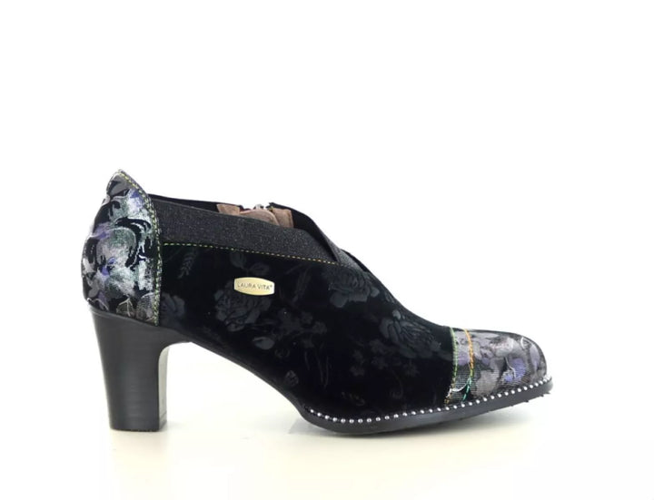 Maak een krachtig stijlstatement met de Laura Vita Elcodieo 42, een elegante gesloten pump die vrouwelijkheid, karakter en comfort moeiteloos combineert. Deze unieke damesschoen is vervaardigd uit soepel leer met textiele accenten en is rijkelijk versierd met een subtiele bloemenprint in de kleurstelling acier/zwart, afgewerkt met metallic glans voor een artistieke flair.