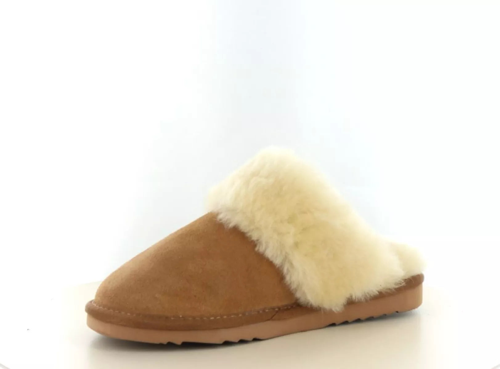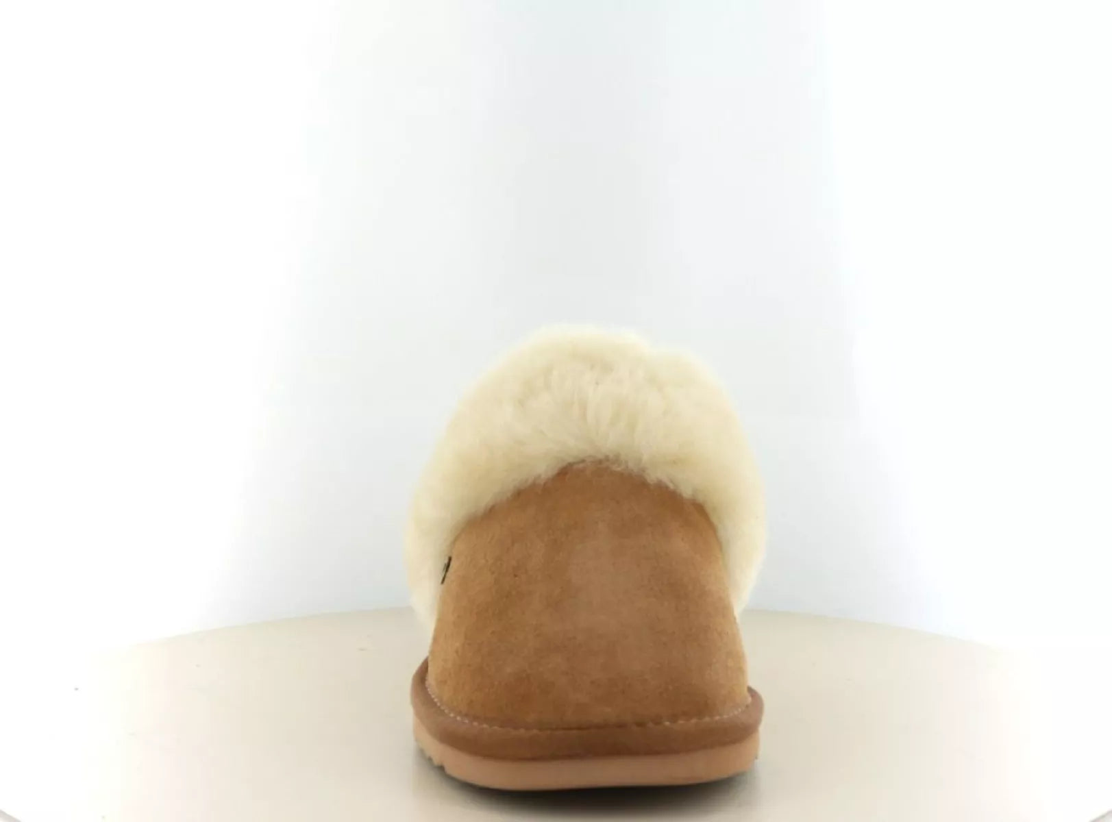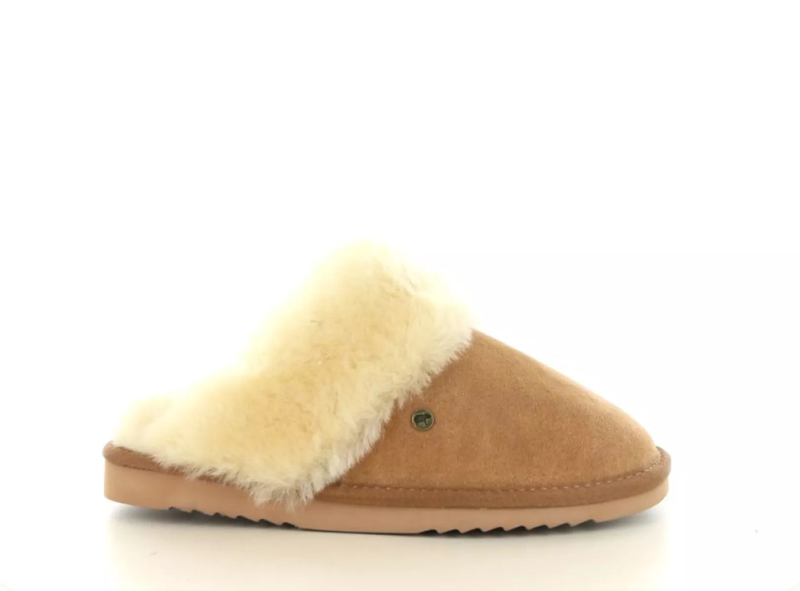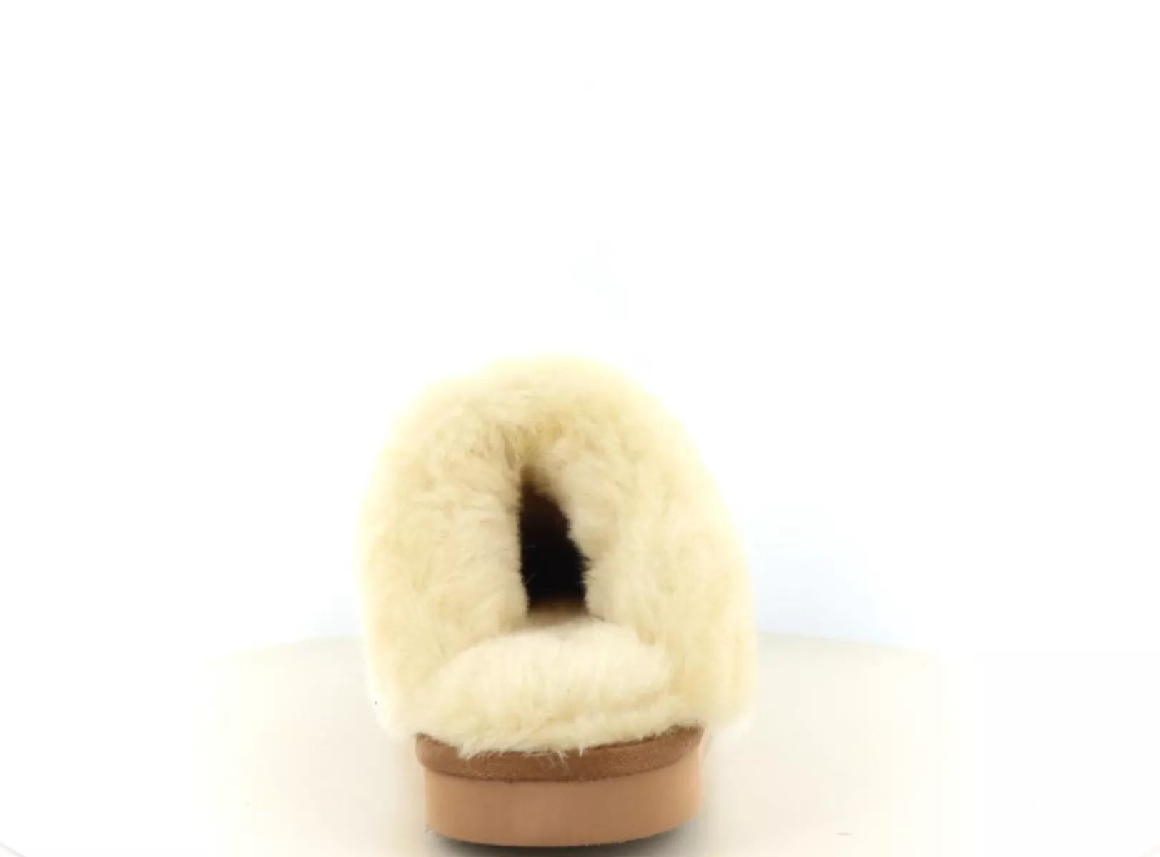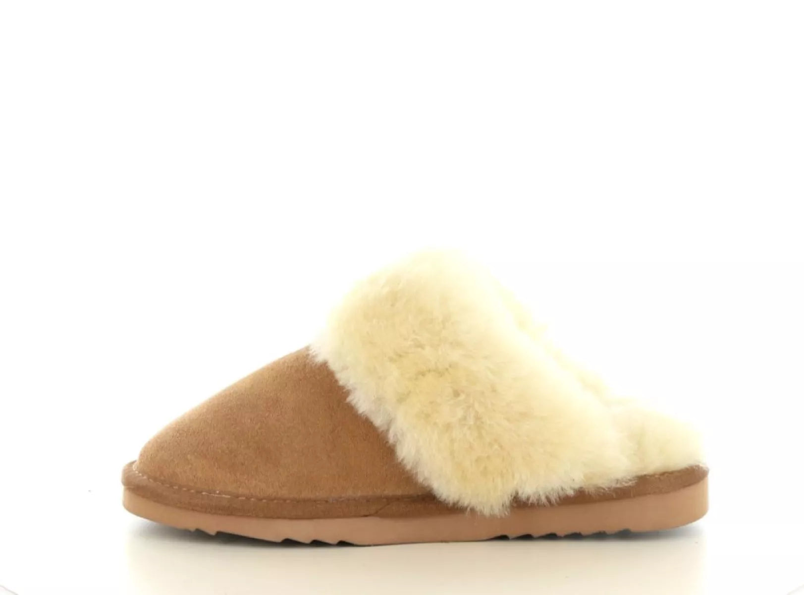 Warmbat Flurry Woman – Luxe suède pantoffel met volle wolkraag in cognac