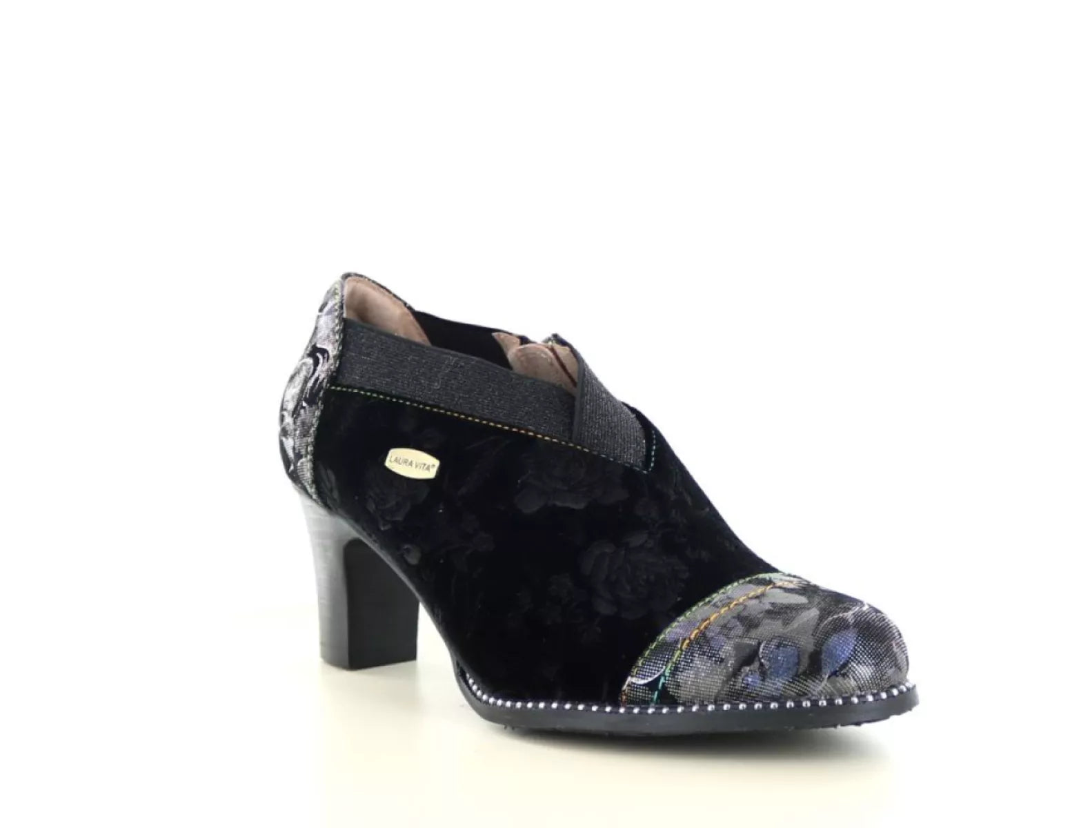 Maak een krachtig stijlstatement met de Laura Vita Elcodieo 42, een elegante gesloten pump die vrouwelijkheid, karakter en comfort moeiteloos combineert. Deze unieke damesschoen is vervaardigd uit soepel leer met textiele accenten en is rijkelijk versierd met een subtiele bloemenprint in de kleurstelling acier/zwart, afgewerkt met metallic glans voor een artistieke flair.