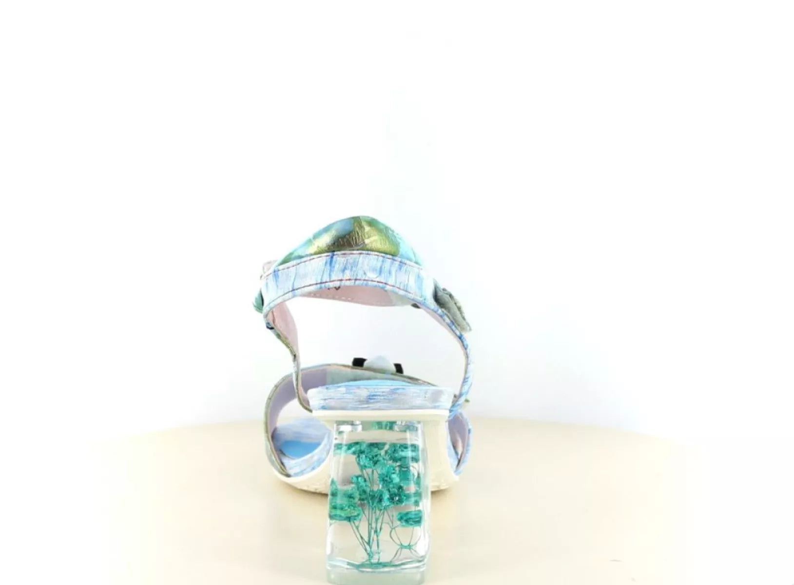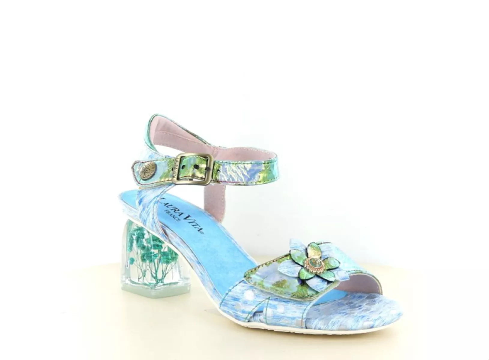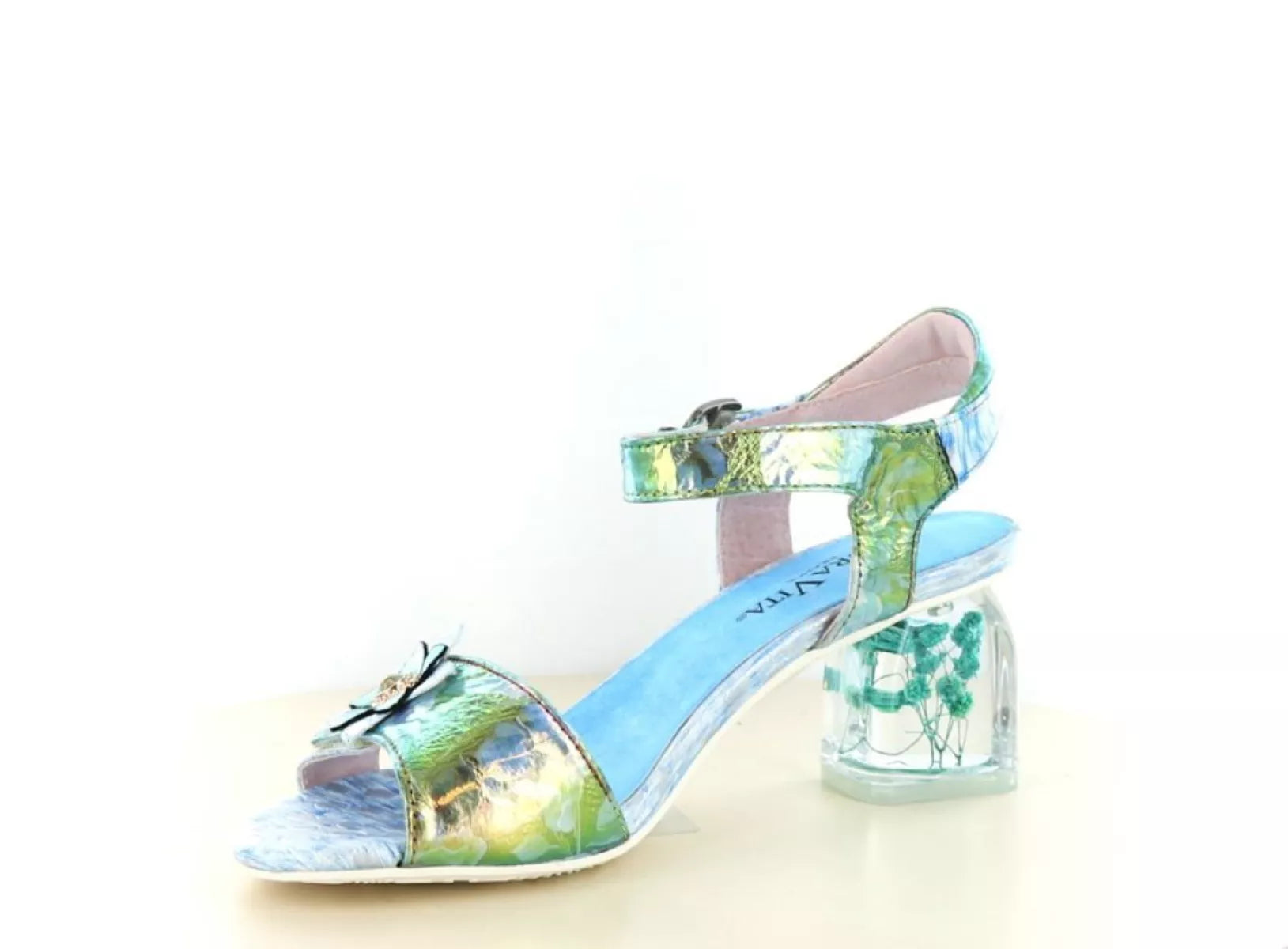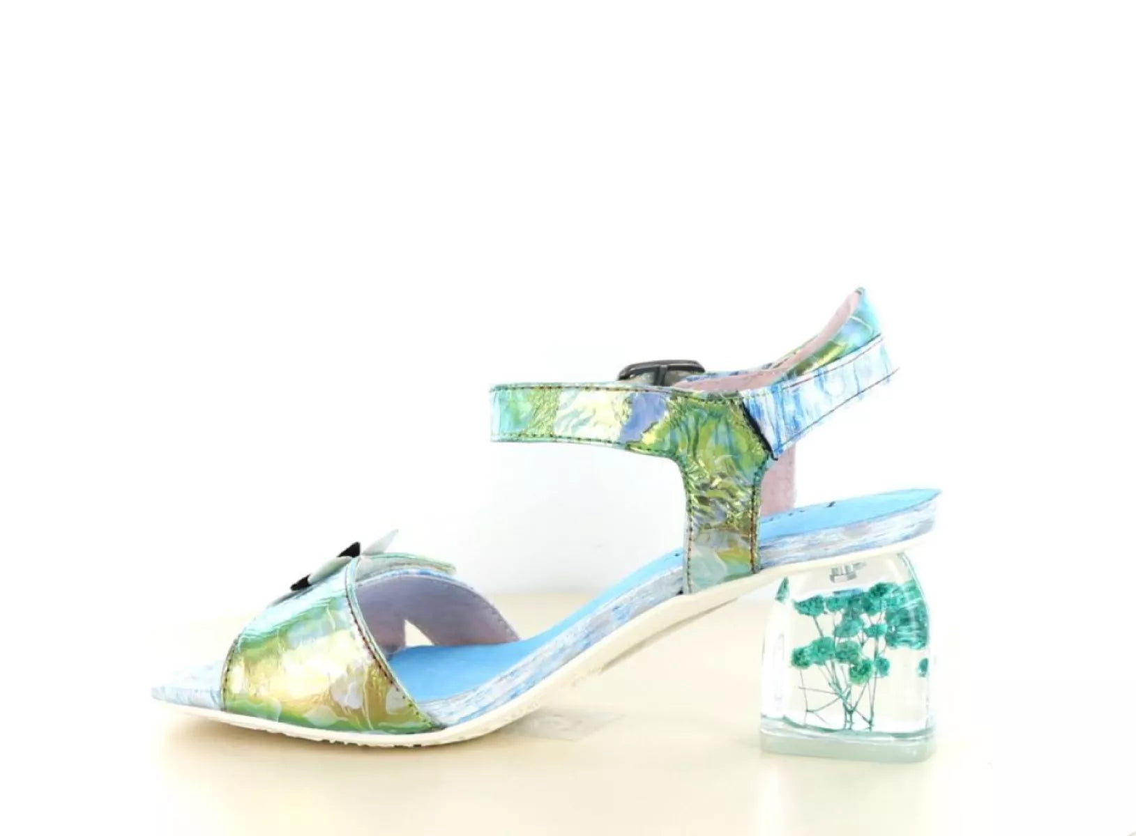Het bovenwerk is uitgevoerd in hoogwaardig leer en afgewerkt met subtiele kleurverlopen en een speels bloemaccent op de voorband. De transparante hak met ingewerkte bloemen is een echte eyecatcher en geeft de sandaal een exclusieve uitstraling, zonder in te leveren op stabiliteit en comfort. Dankzij de klittenbandsluiting is de sandaal eenvoudig verstelbaar en sluit hij mooi aan rondom de enkel.