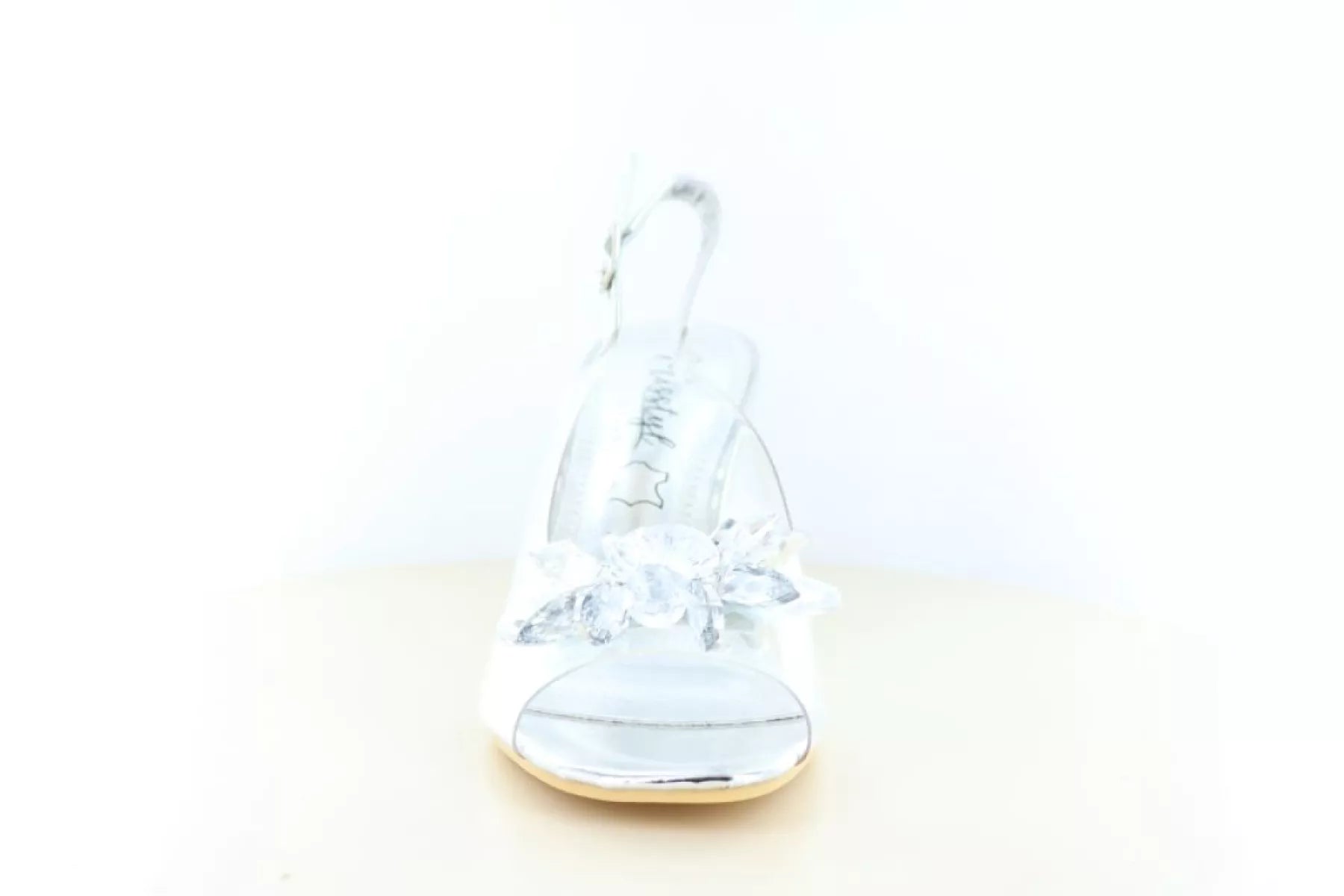 Op de voorzijde van de pump bevindt zich een decoratieve bloem in zilverkleurige tinten, wat zorgt voor een opvallend en vrouwelijk accent. De elegante transparante hak geeft de schoen een modieuze uitstraling en maakt het ontwerp extra bijzonder, terwijl de vorm van de hak tegelijkertijd zorgt voor voldoende stabiliteit tijdens het lopen.