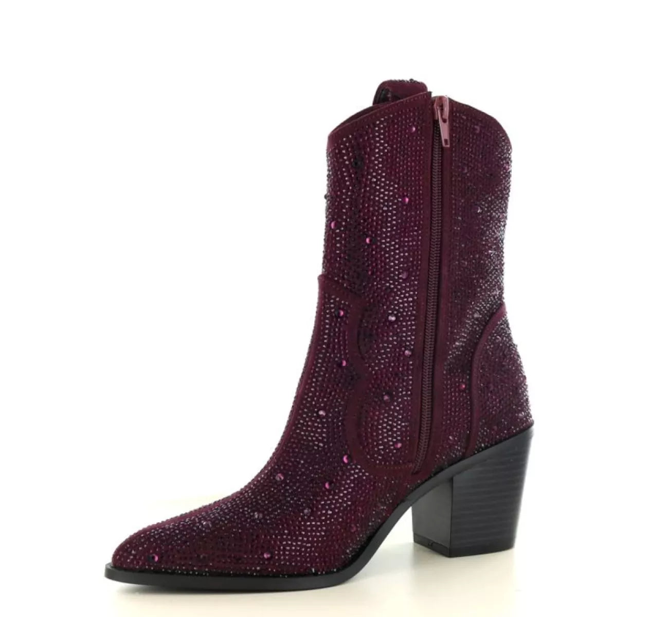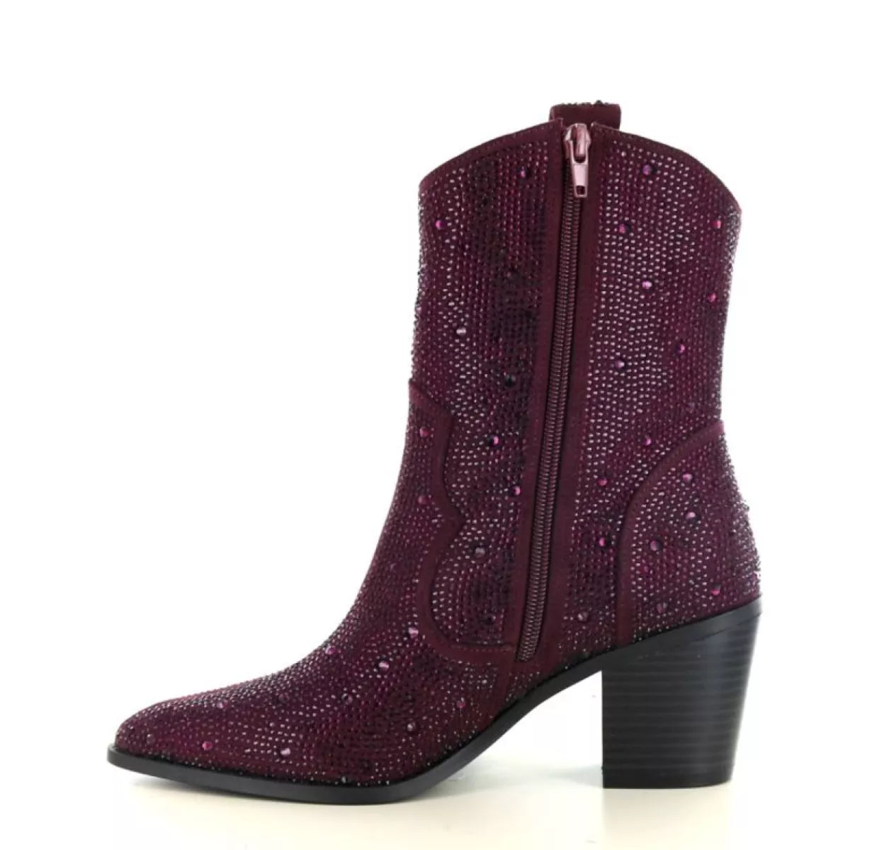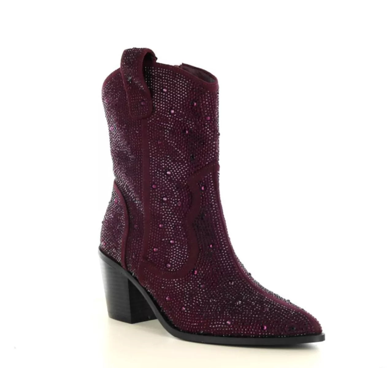 De La Strada 2303493 western enkellaars in aubergine is een echte blikvanger. Dit model combineert de stoere uitstraling van een klassieke westernlaars met een glamoureuze touch dankzij de sprankelende strass steentjes die het hele design laten schitteren. De diepe aubergine tint geeft de laars een luxe en modieuze uitstraling die moeiteloos aansluit bij de laatste trends.