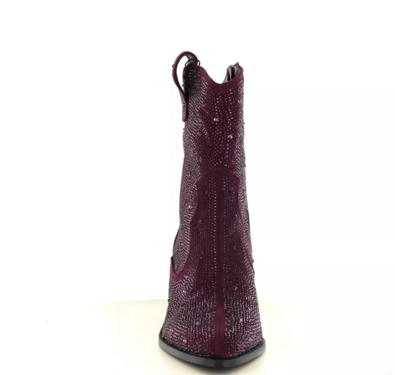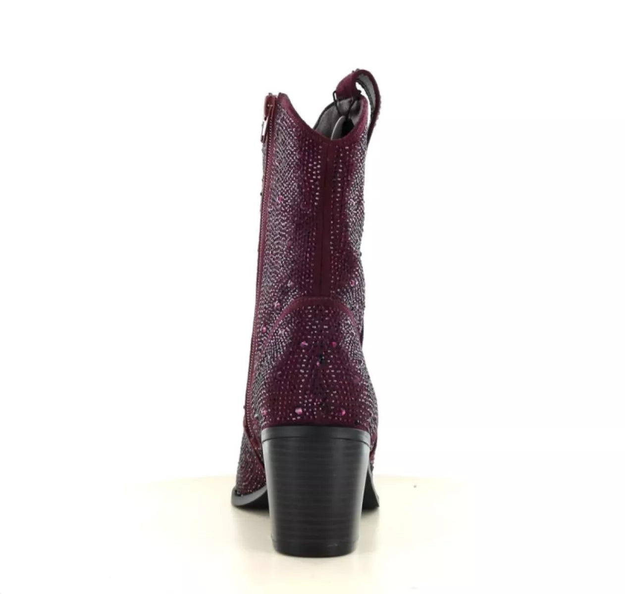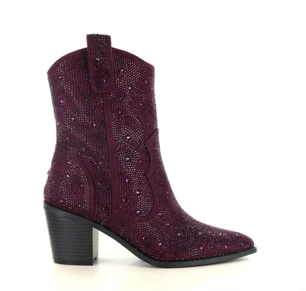 De La Strada 2303493 western enkellaars in aubergine is een echte blikvanger. Dit model combineert de stoere uitstraling van een klassieke westernlaars met een glamoureuze touch dankzij de sprankelende strass steentjes die het hele design laten schitteren. De diepe aubergine tint geeft de laars een luxe en modieuze uitstraling die moeiteloos aansluit bij de laatste trends.