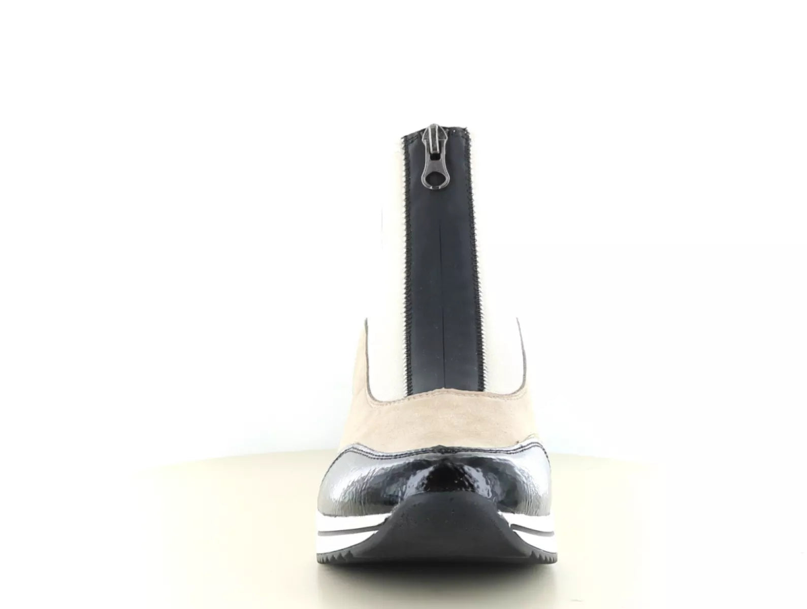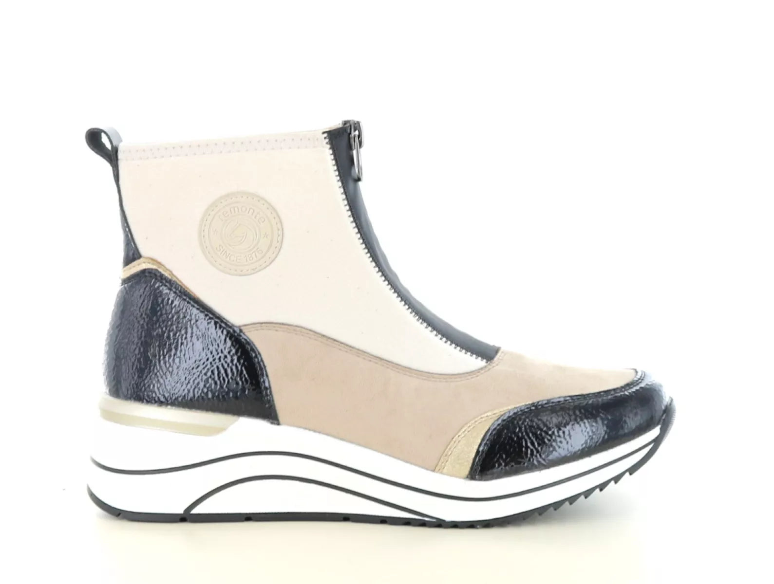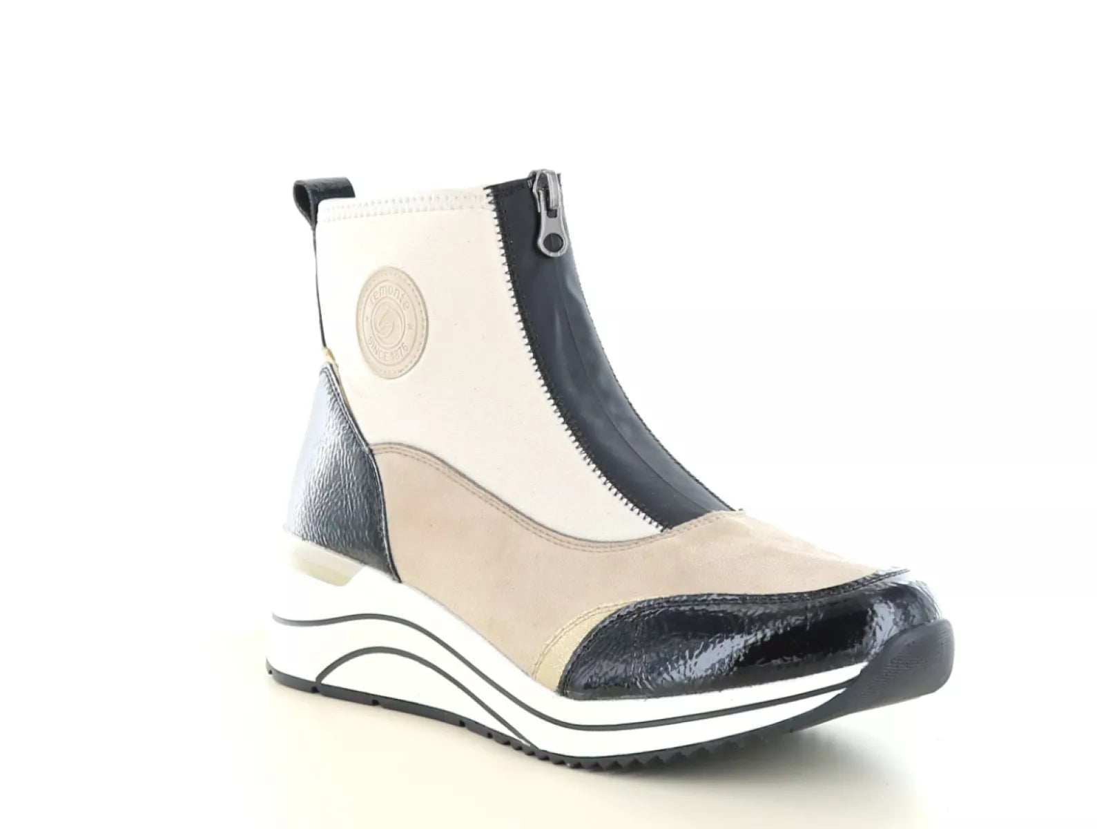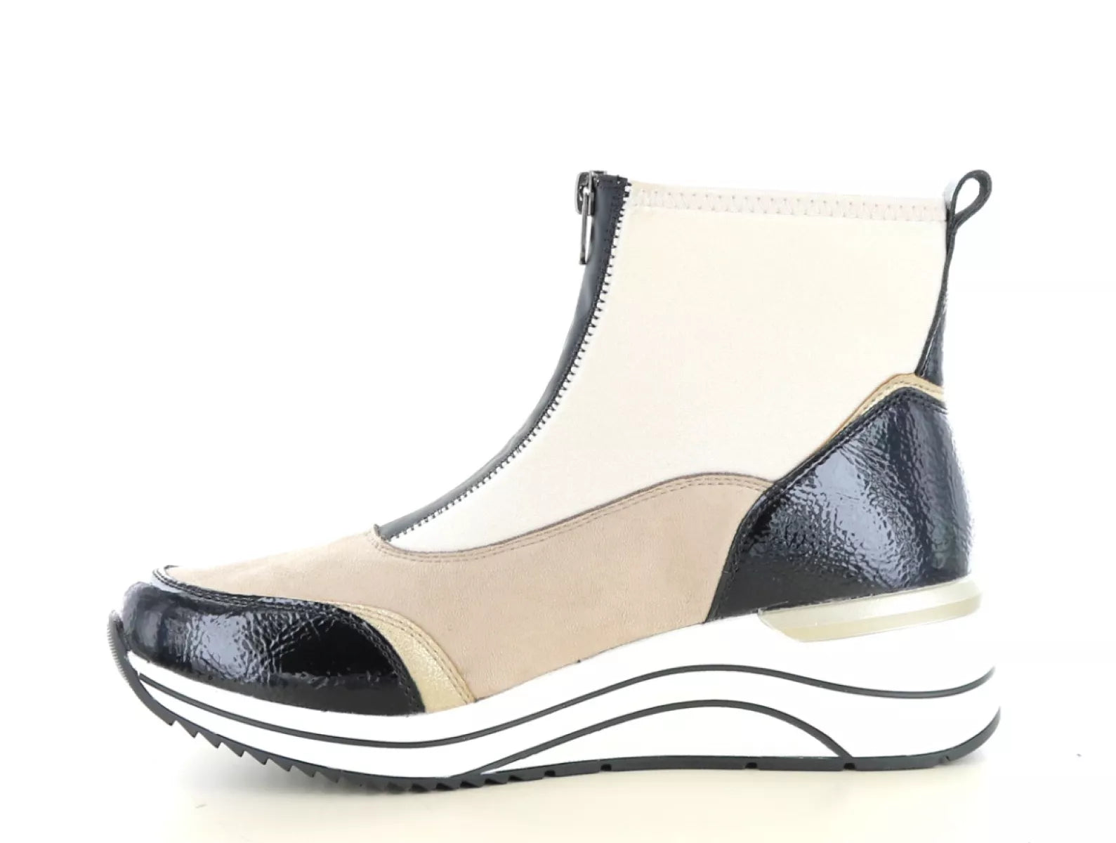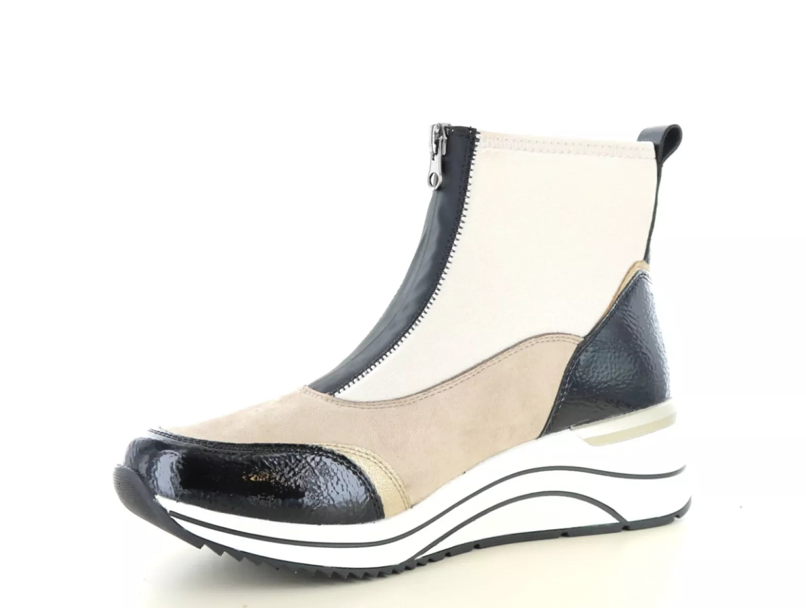 De Remonte D0T78 enkellaars in zwart/jute is een echte blikvanger voor dames die stijl en comfort willen combineren. Het speelse kleurcontrast van zwart, beige en subtiele metallic accenten geeft deze schoen een sportieve en moderne uitstraling. Dankzij de praktische ritssluiting trek je de laars moeiteloos aan en uit, terwijl de comfortabele wijdtemaat G (normale pasvorm) en het verwisselbare voetbed zorgen voor optimaal draaggemak – ook geschikt voor steunzolen.