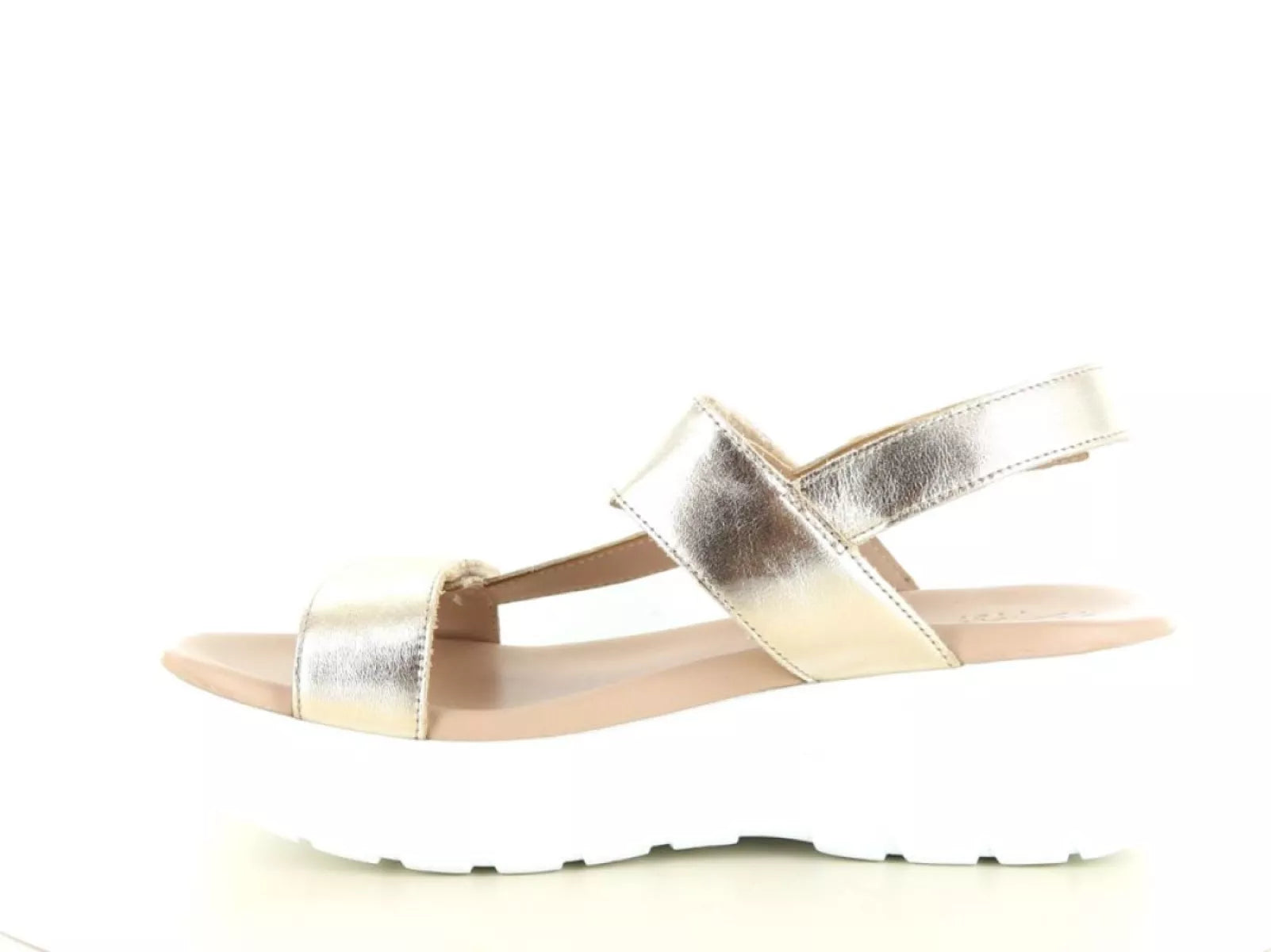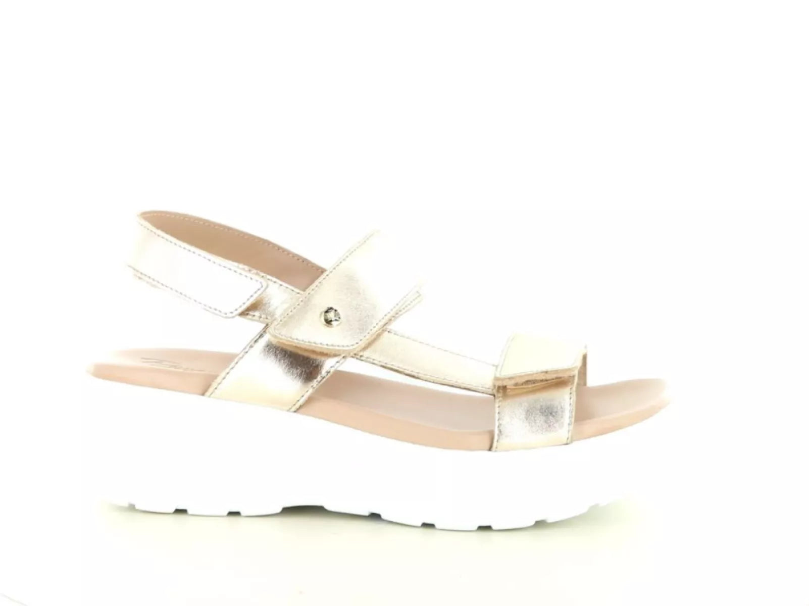 De Panama Jack Noor Shine B1 is een elegante en comfortabele dames sandaal, uitgevoerd in een stijlvolle goudkleur. Het bovenwerk is vervaardigd van hoogwaardig nappaleer, wat zorgt voor een luxe uitstraling en duurzaamheid. De leren binnenvoering biedt ademend comfort, ideaal voor warme zomerdagen.