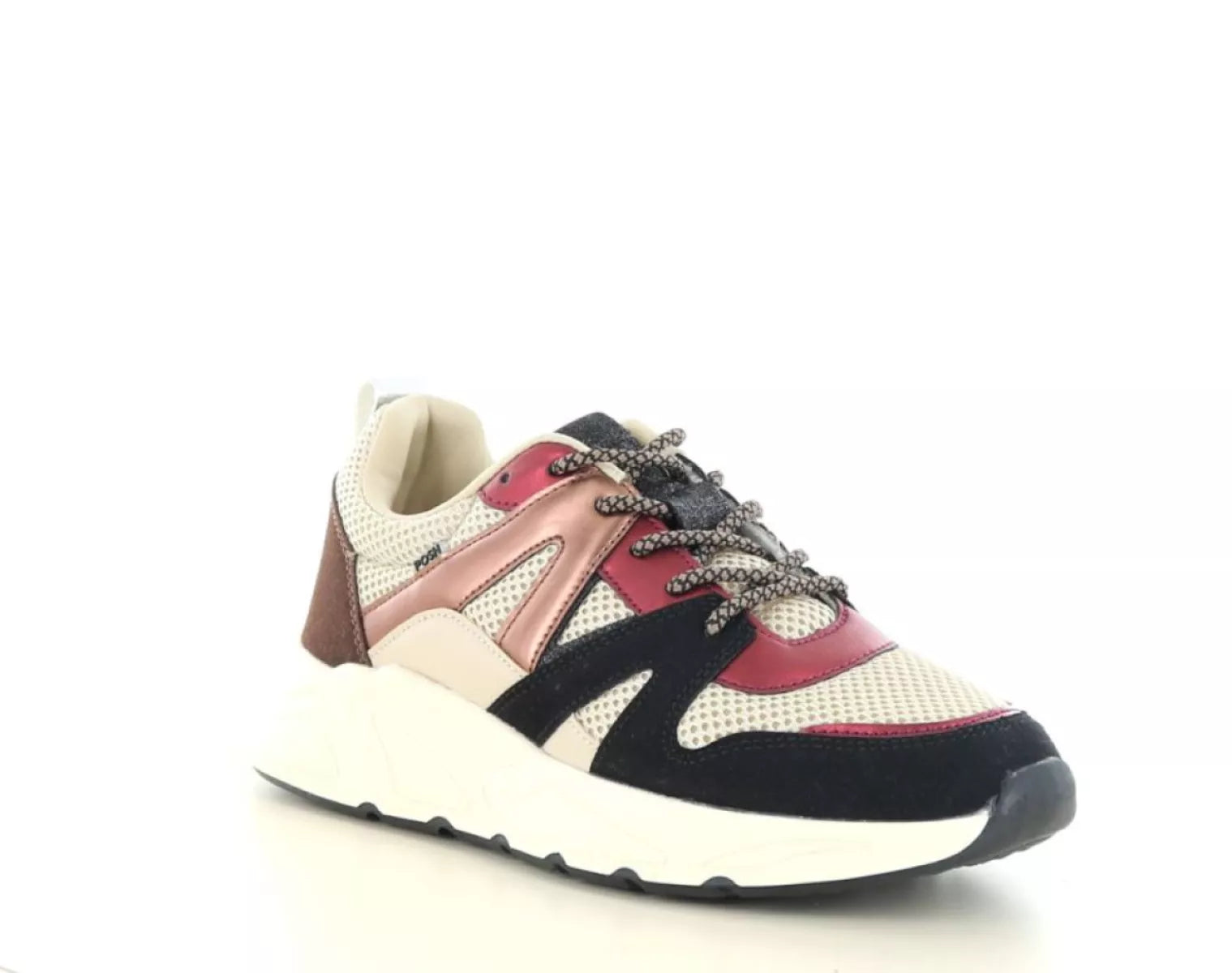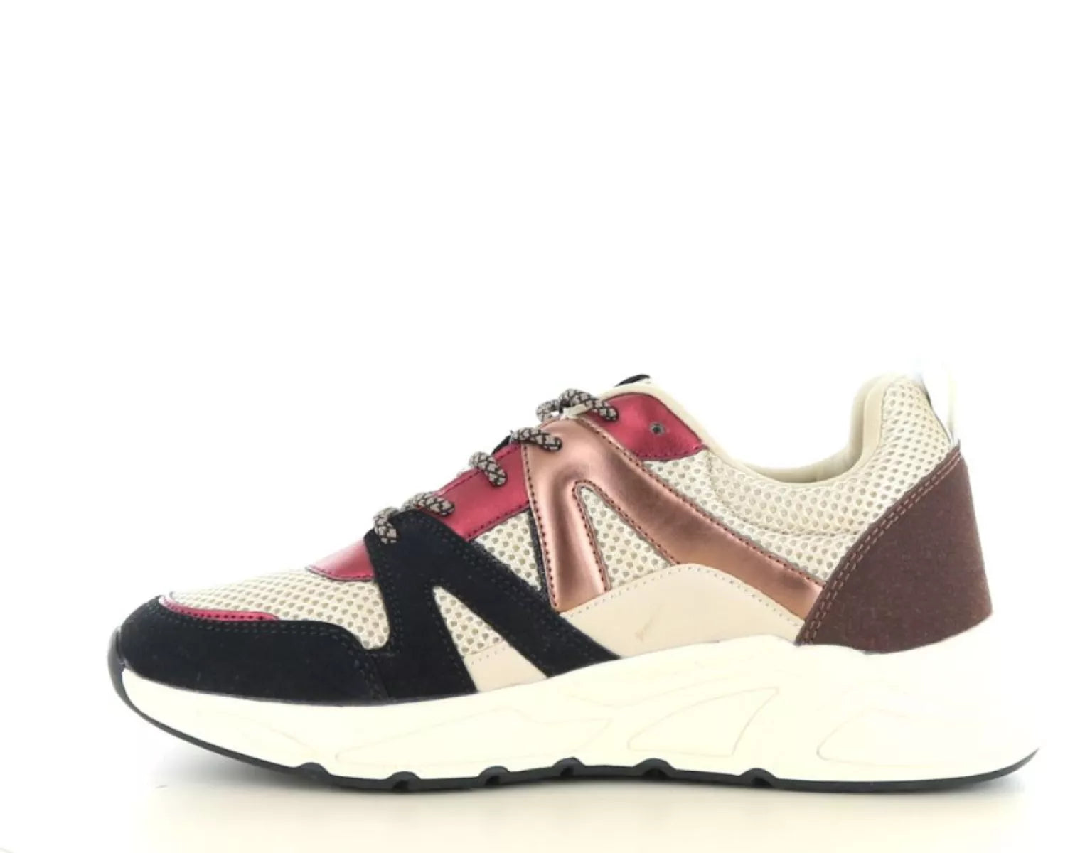 De Posh by Poelman C18582 sneaker is dé must-have voor dames die houden van een sportieve stijl met een modieuze twist. Het design in beige met metallic rosé, bordeaux en zwarte accenten zorgt voor een opvallende en eigentijdse uitstraling. Dankzij de combinatie van mesh en synthetisch materiaal ademt de schoen goed en voelt hij licht aan, waardoor hij ideaal is voor dagelijks gebruik.
