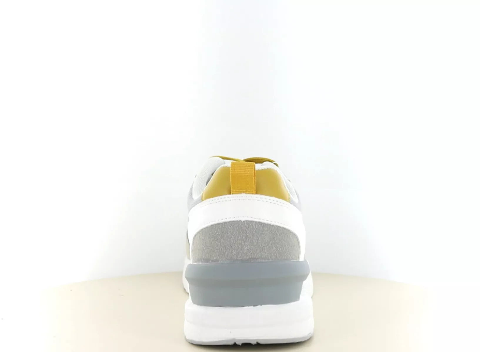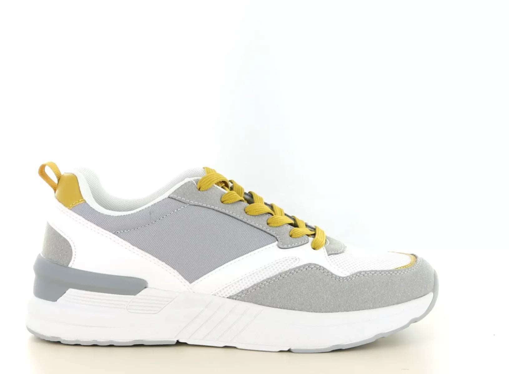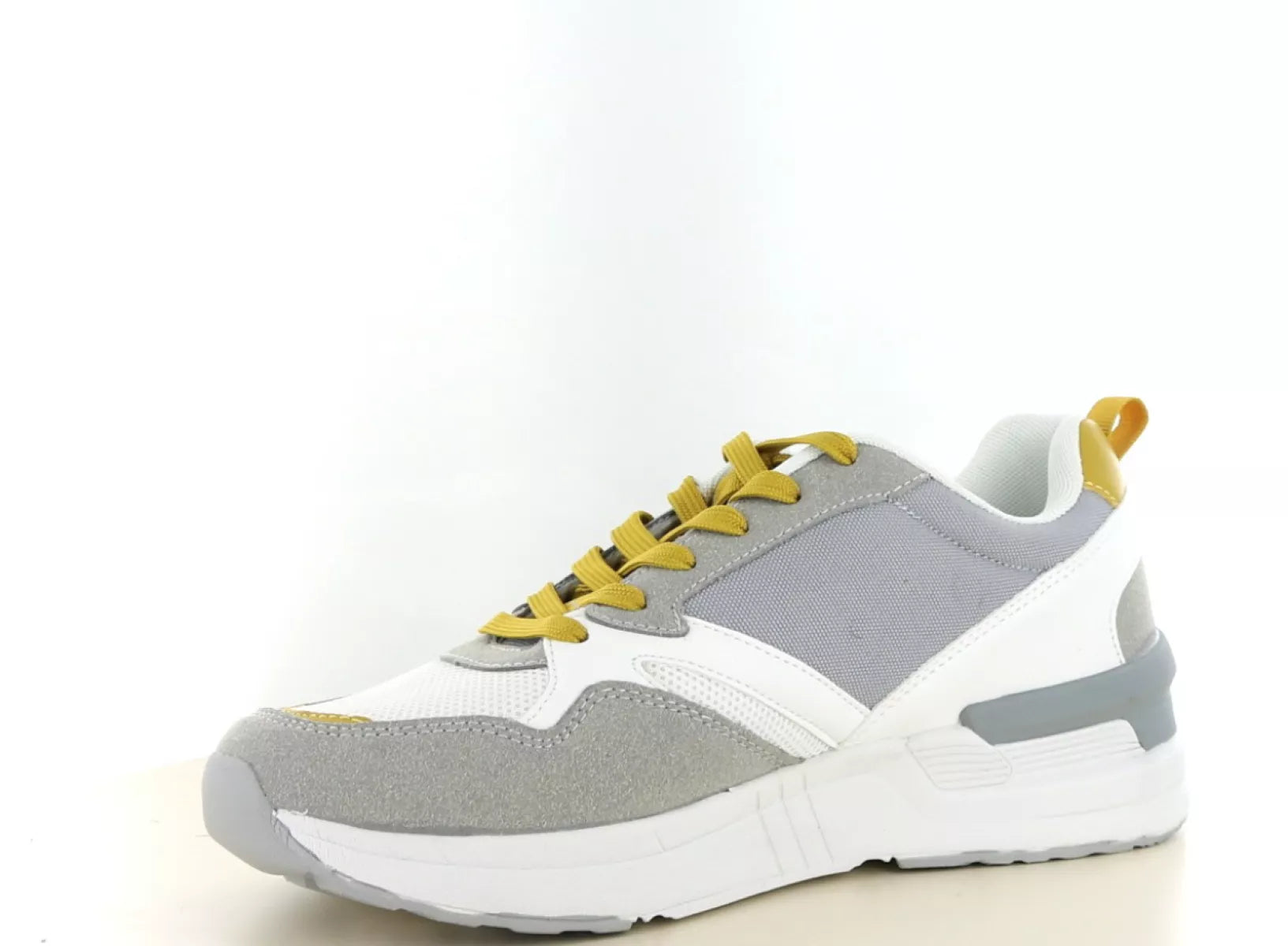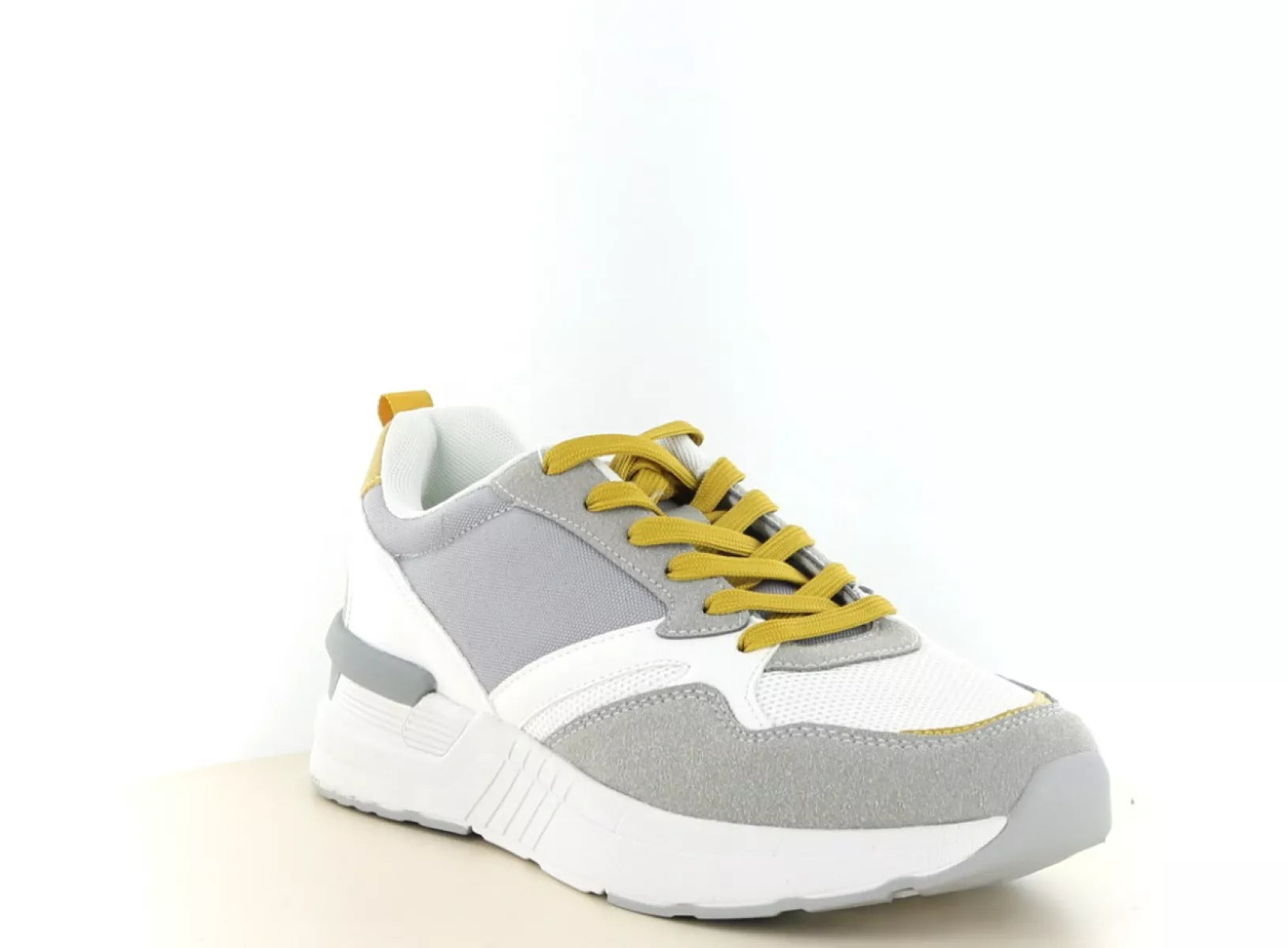 - Trendy combinatie van grijs, wit en mosterdgele accenten