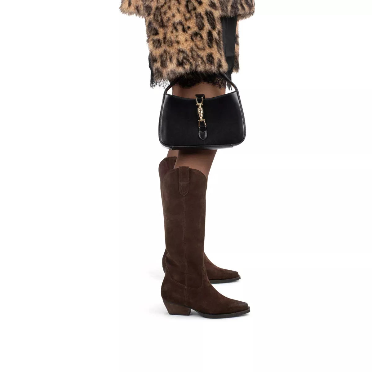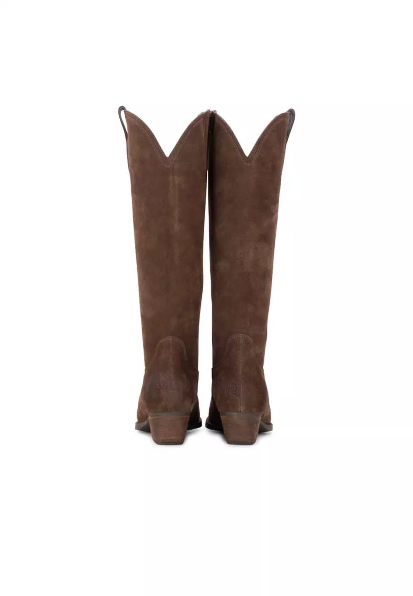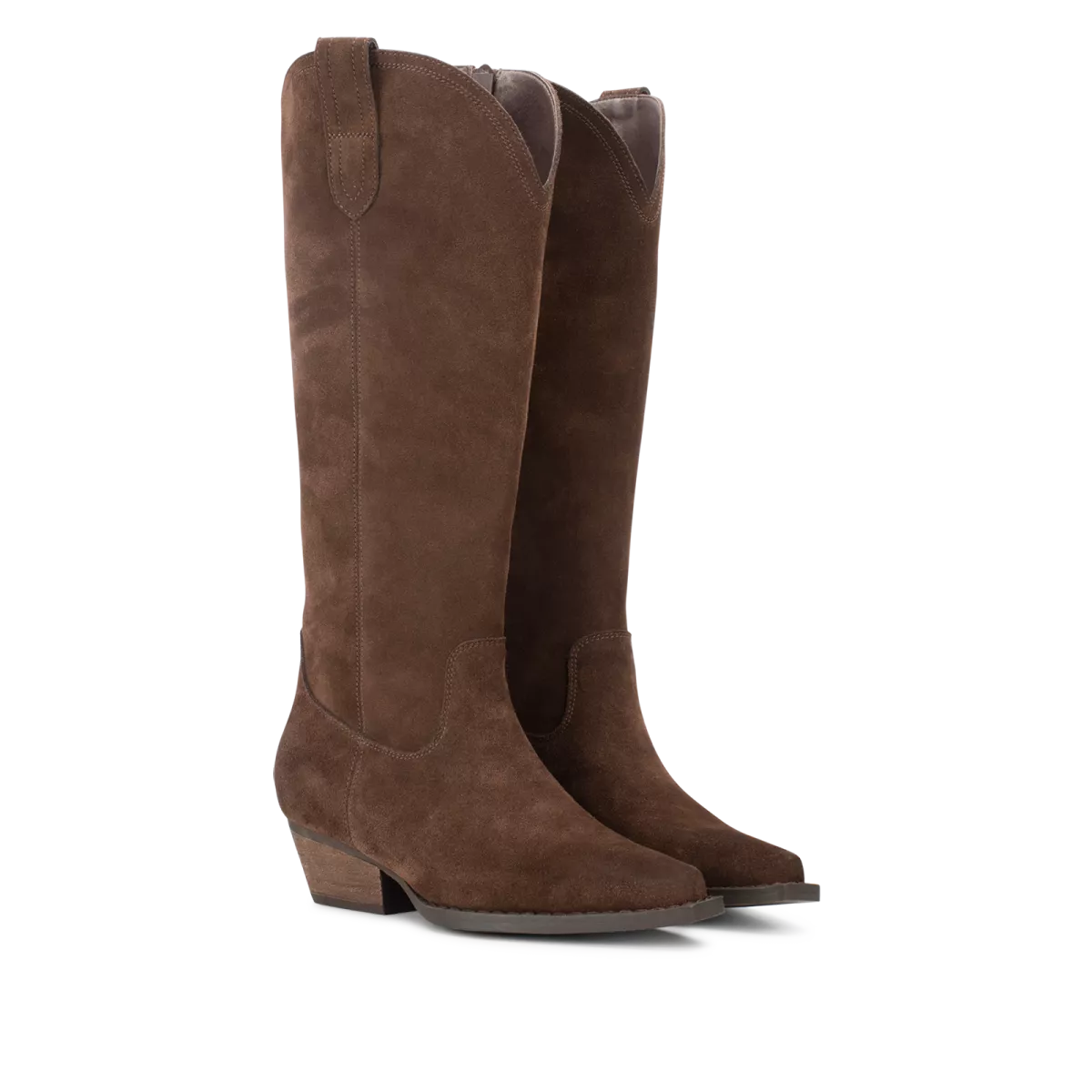De PS Poelman CLSHN-3A231 is een modieuze hoge laars die western vibes combineert met eigentijdse elegantie. Het zachte nubuck in een warme cappuccinotint geeft de laars een luxe uitstraling, terwijl de spitse neus en decoratieve stiknaden zorgen voor een stoere, authentieke cowboylook.