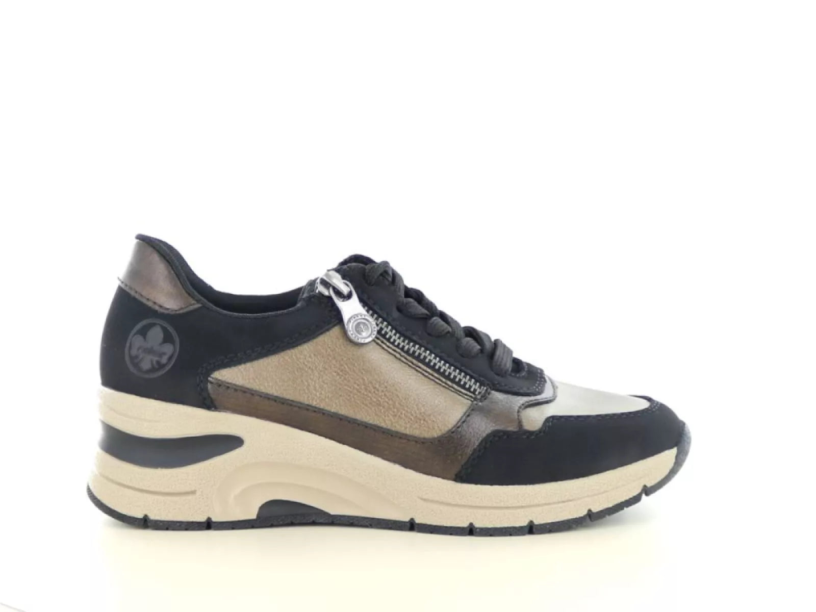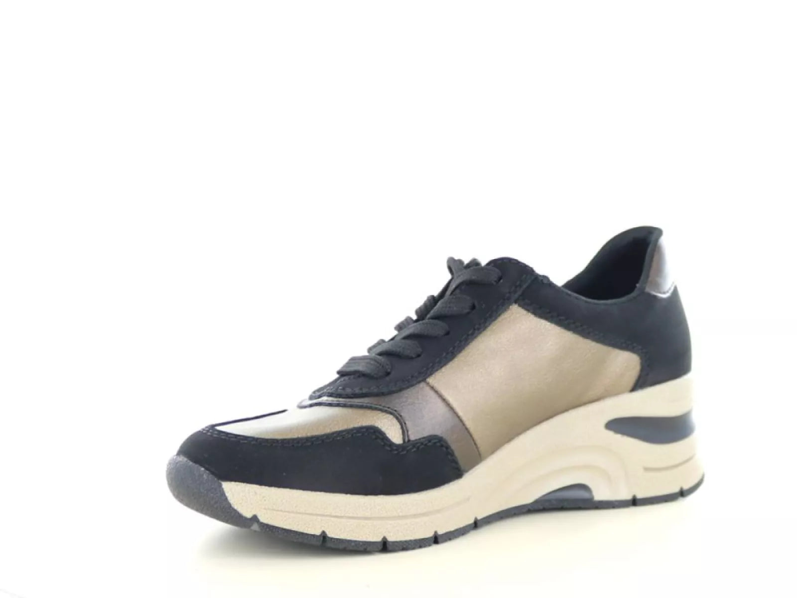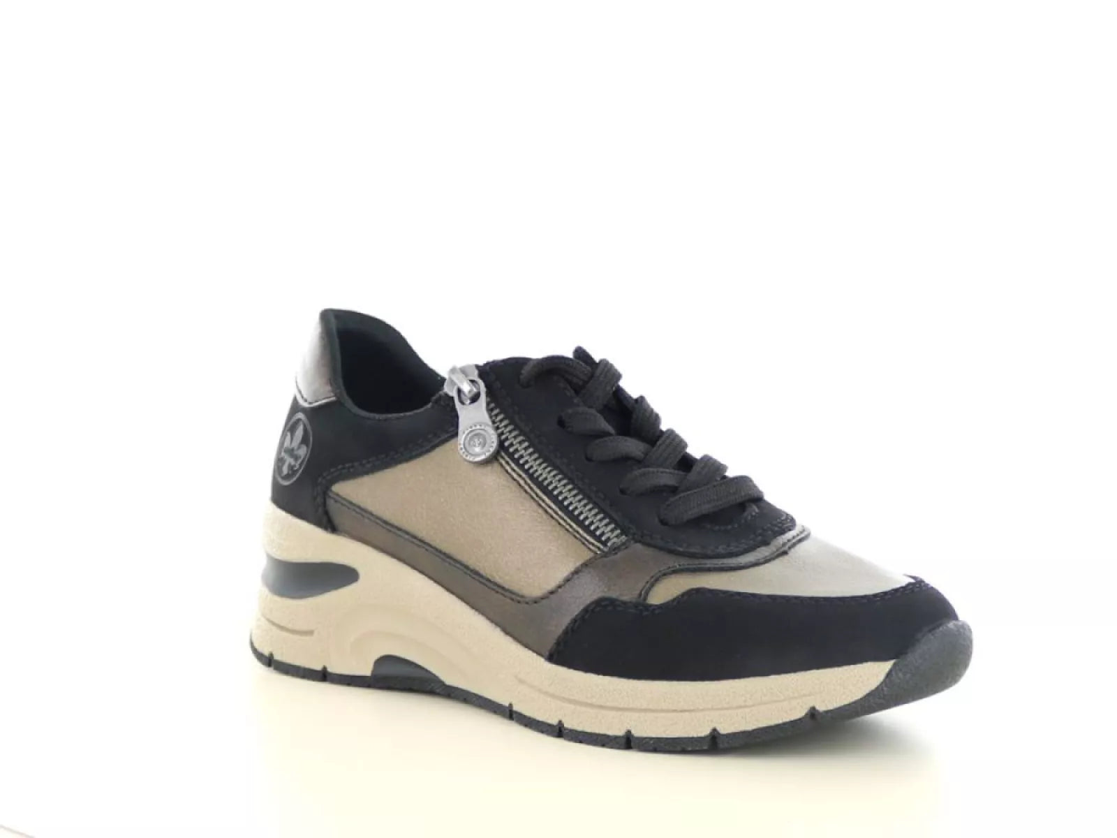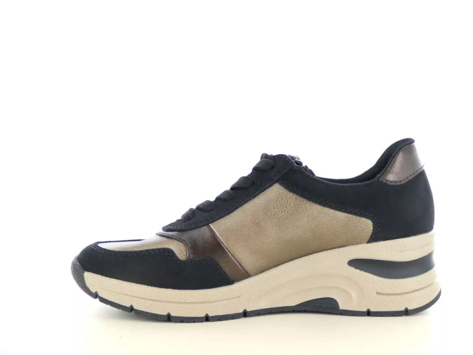 De Rieker N9301 in de kleur schwarz/bronze is dé perfecte keuze voor wie comfort, gemak en een stijlvolle look wil combineren. Deze damessneaker straalt sportieve elegantie uit dankzij het metallic brons in combinatie met diep zwart. Ideaal voor elke dag – of je nu een stadswandeling maakt of casual gekleed op pad gaat.