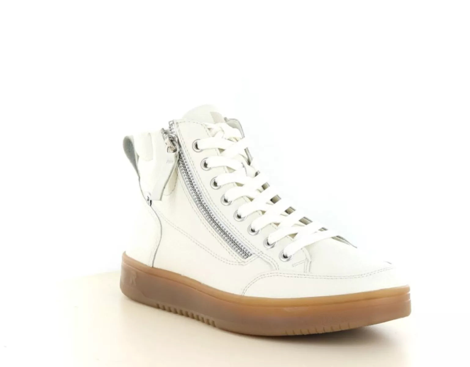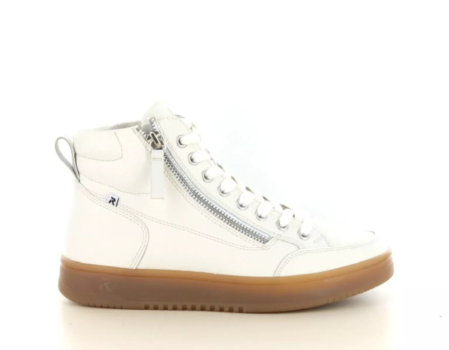 Maak je outfit compleet met de Rieker W1971 dames veterschoen. Deze stijlvolle hoge sneaker in fris wit leer combineert een sportieve uitstraling met het ongeëvenaarde comfort dat je van Rieker gewend bent. De warme cognackleurige zool geeft de schoen een trendy contrast, waardoor hij zowel casual als gekleder te dragen is.
